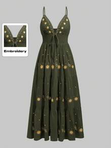 Fairycore Robe décontracté A-ligne de vacances brodée de mystique étoile et lune avec bretelle spaghetti pour femme