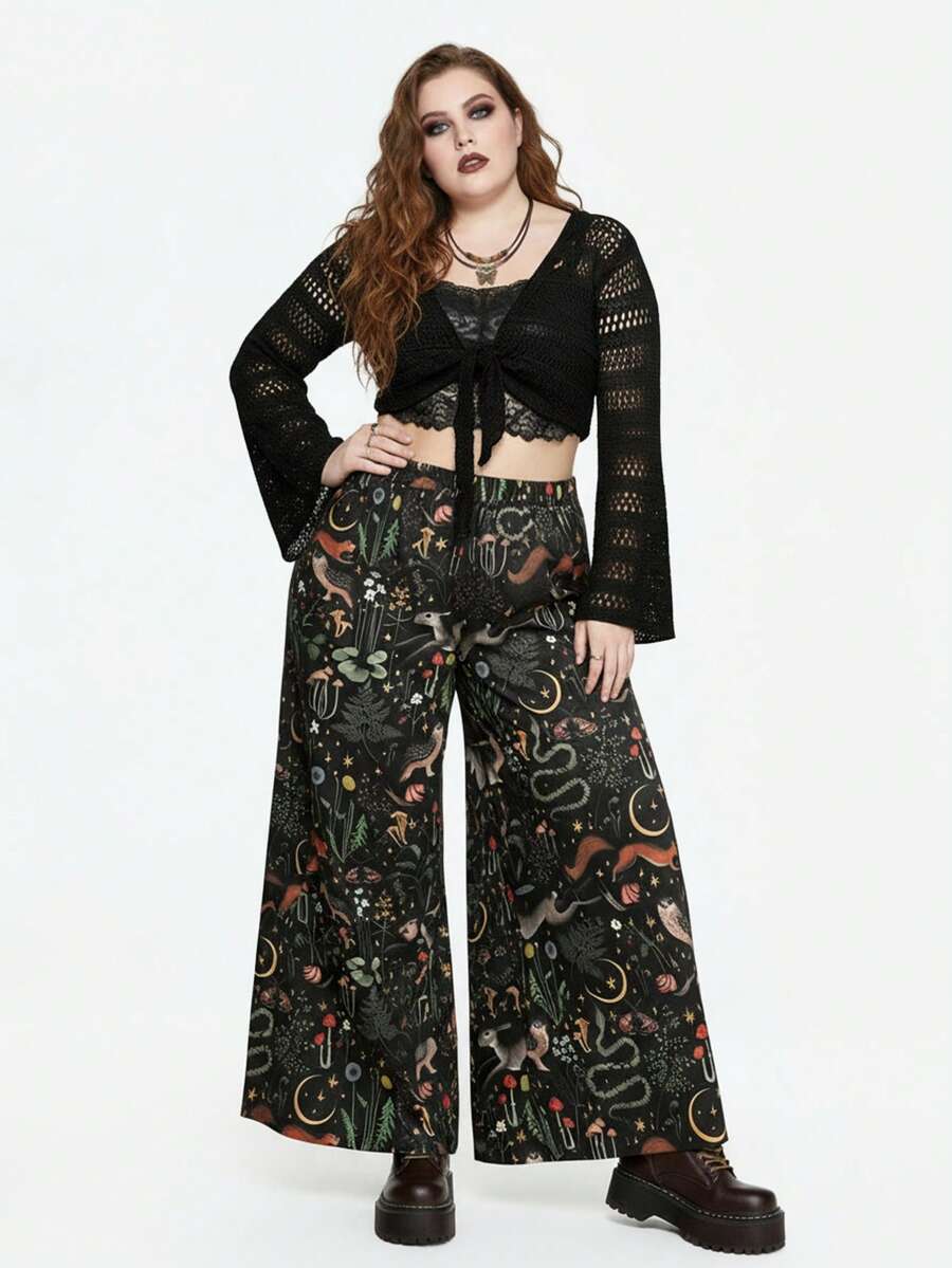 Fairycore Pantalon ample hippy avec jambe droite et taille élastique, grande taille avec impression animale et végétale