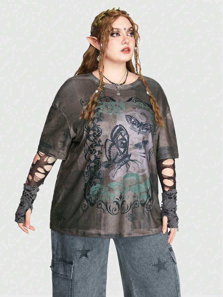 Fairycore Plus T-shirt Imprimé Papillon Déchiré
