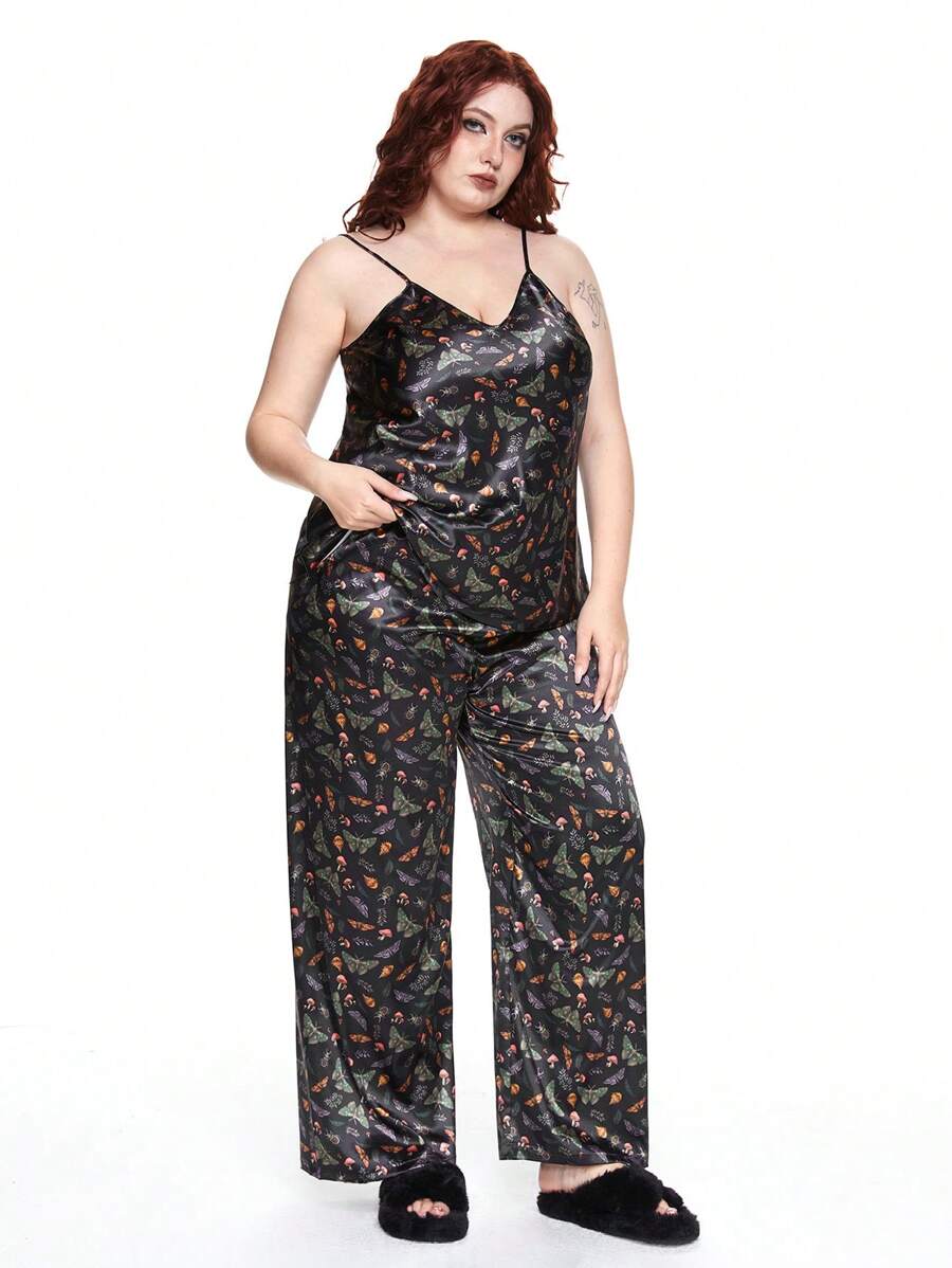 Fairycore Ensemble de camisole et pantalon de détente en satin imprimé partout avec motifs de papillon, champignon et floral pour grande taille