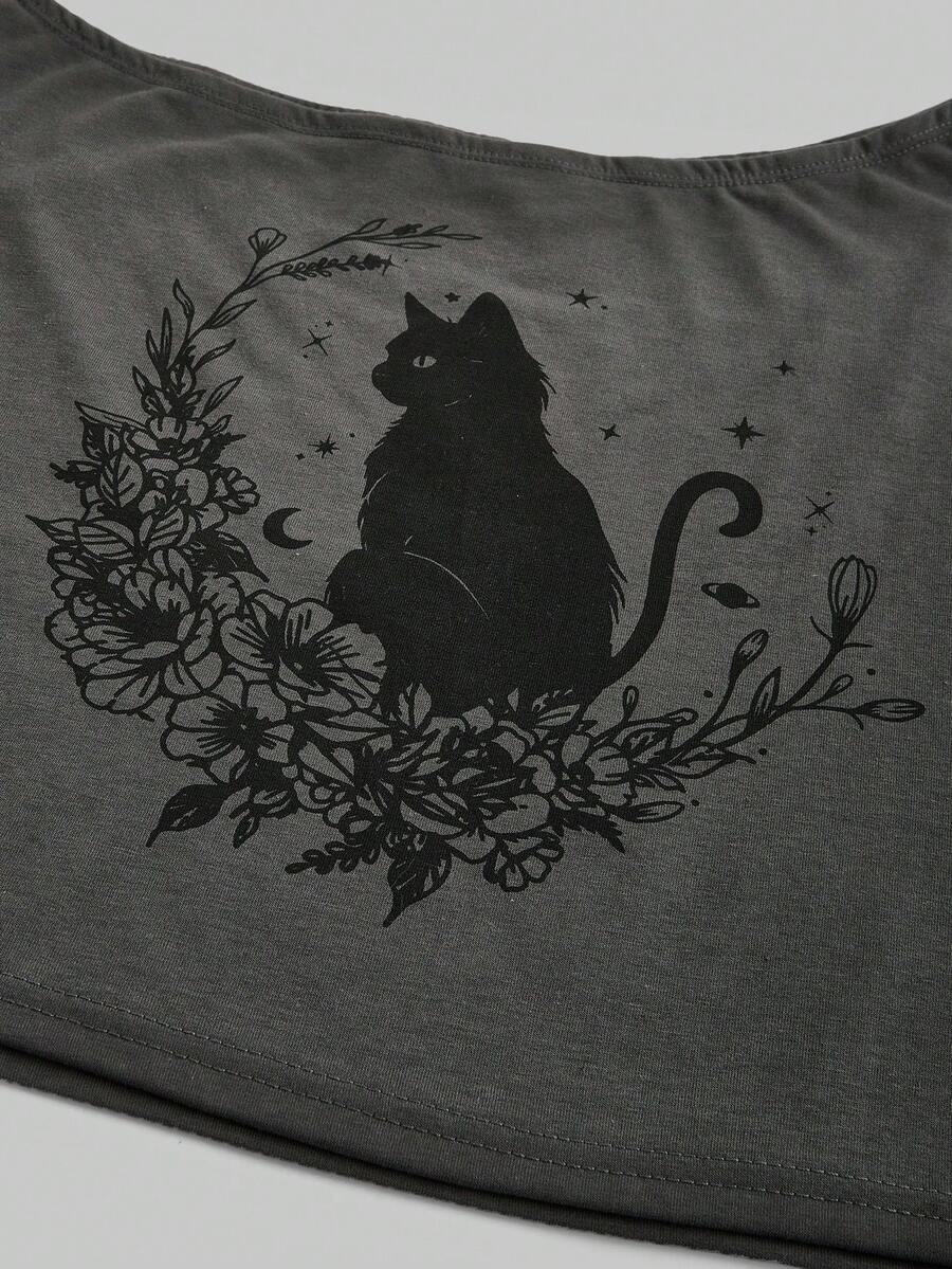 Fairycore T-shirt décontracté asymétrique à manches courtes avec col imprimé pour femmes de grande taille, imprimé chat et fleurs, pour l'été
