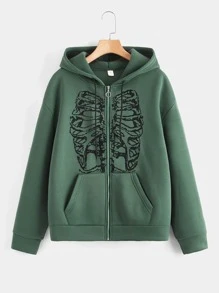 Fairycore Sweat-shirt à capuche à imprimé squelette zippé à doublure thermique