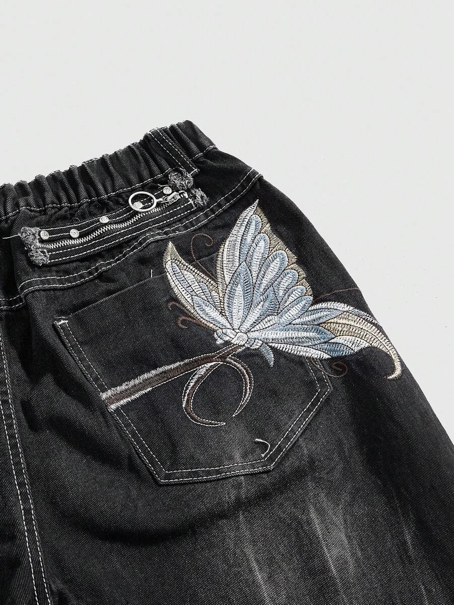 Fairycore Jeans en denim vintage lavé avec broderie papillon pour grandes tailles femmes