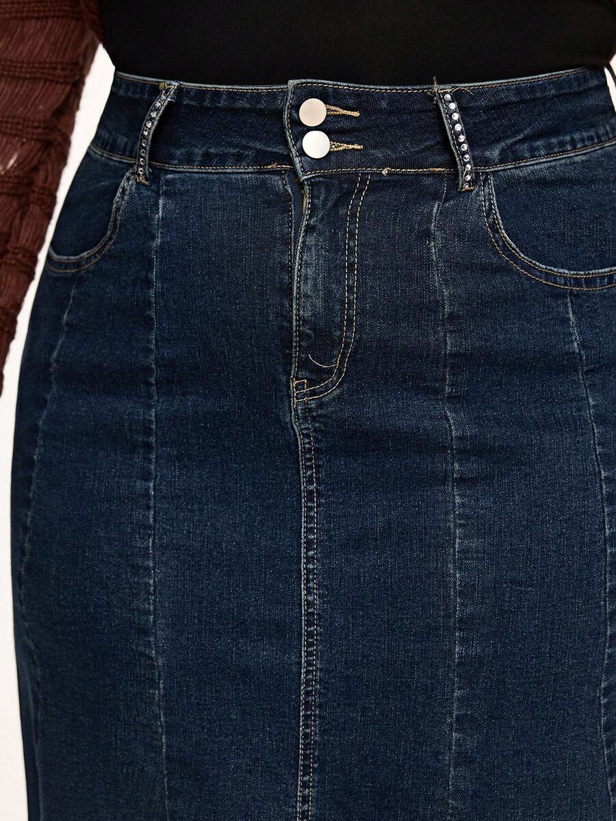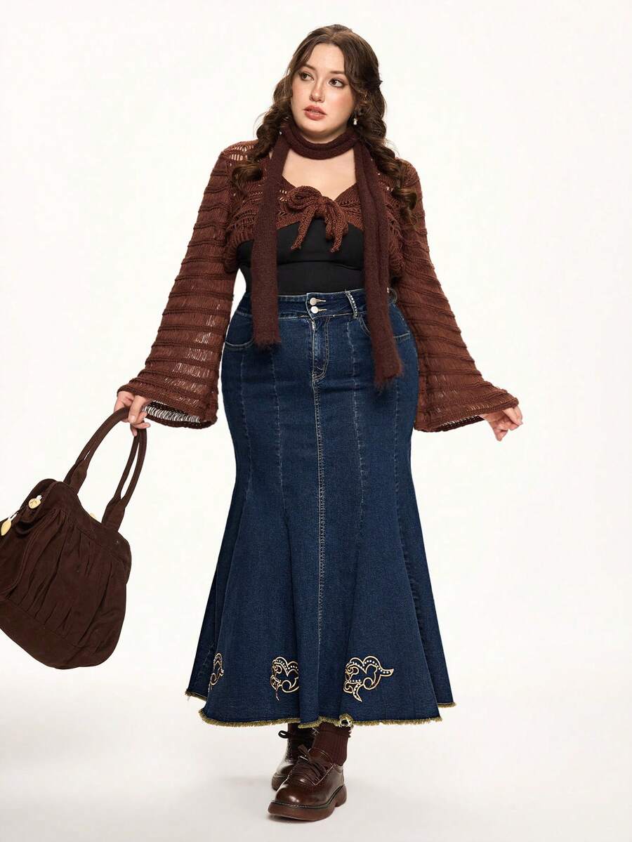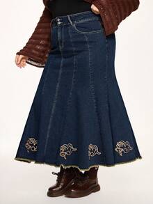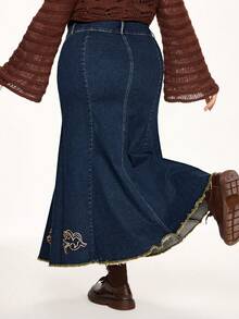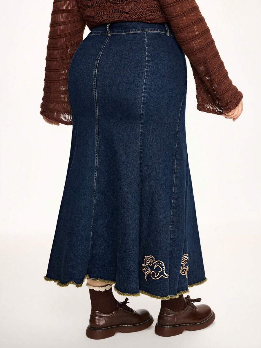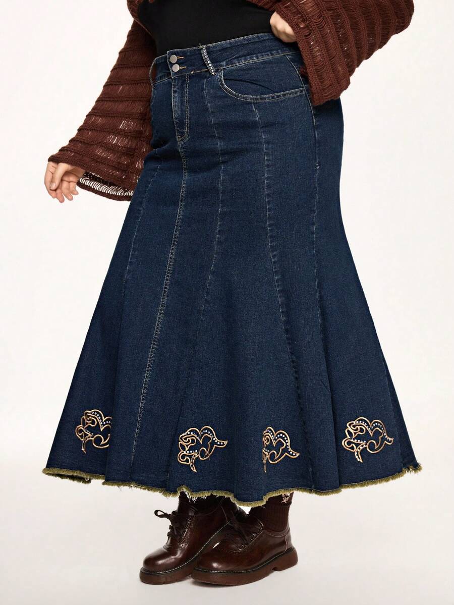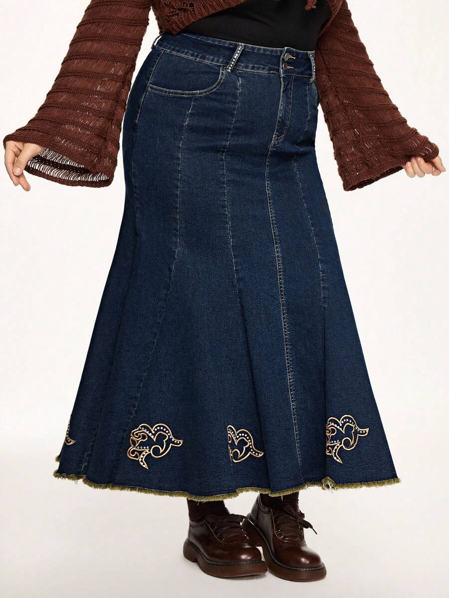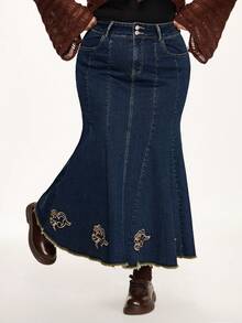 Fairycore Jupe mi-longue en jean pour femmes grandes tailles avec ourlet de sirène, décoration de broderie florale vintage et de strass