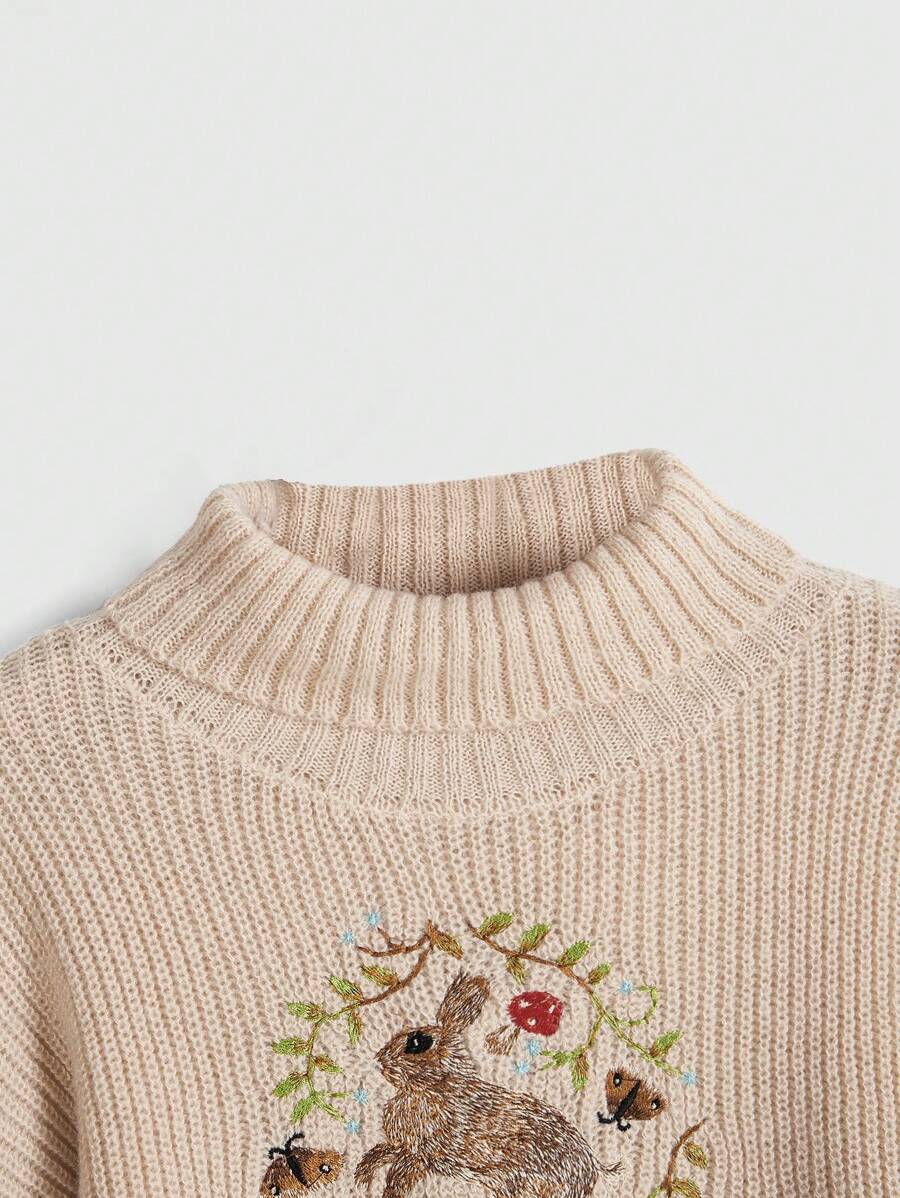Fairycore Pullover ample à col rond femme avec broderie de style occidental de cerf, champignons et fleurs