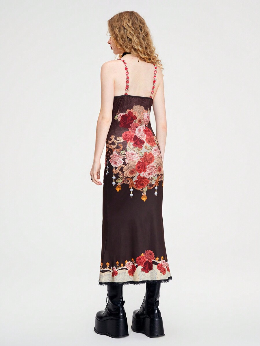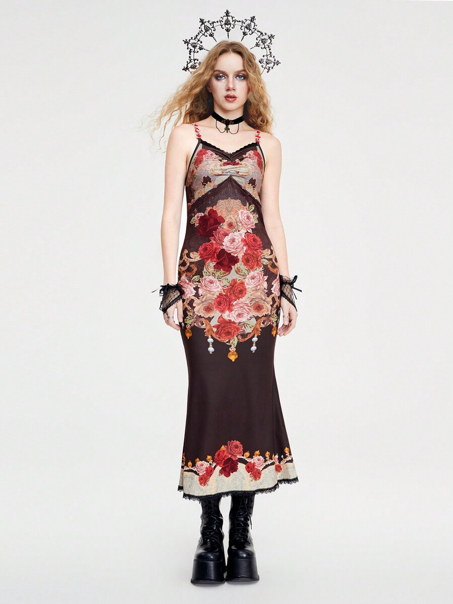 Fairycore Robe sirène vintage rose à motif floral pour femme avec bretelles en dentelle, style palace