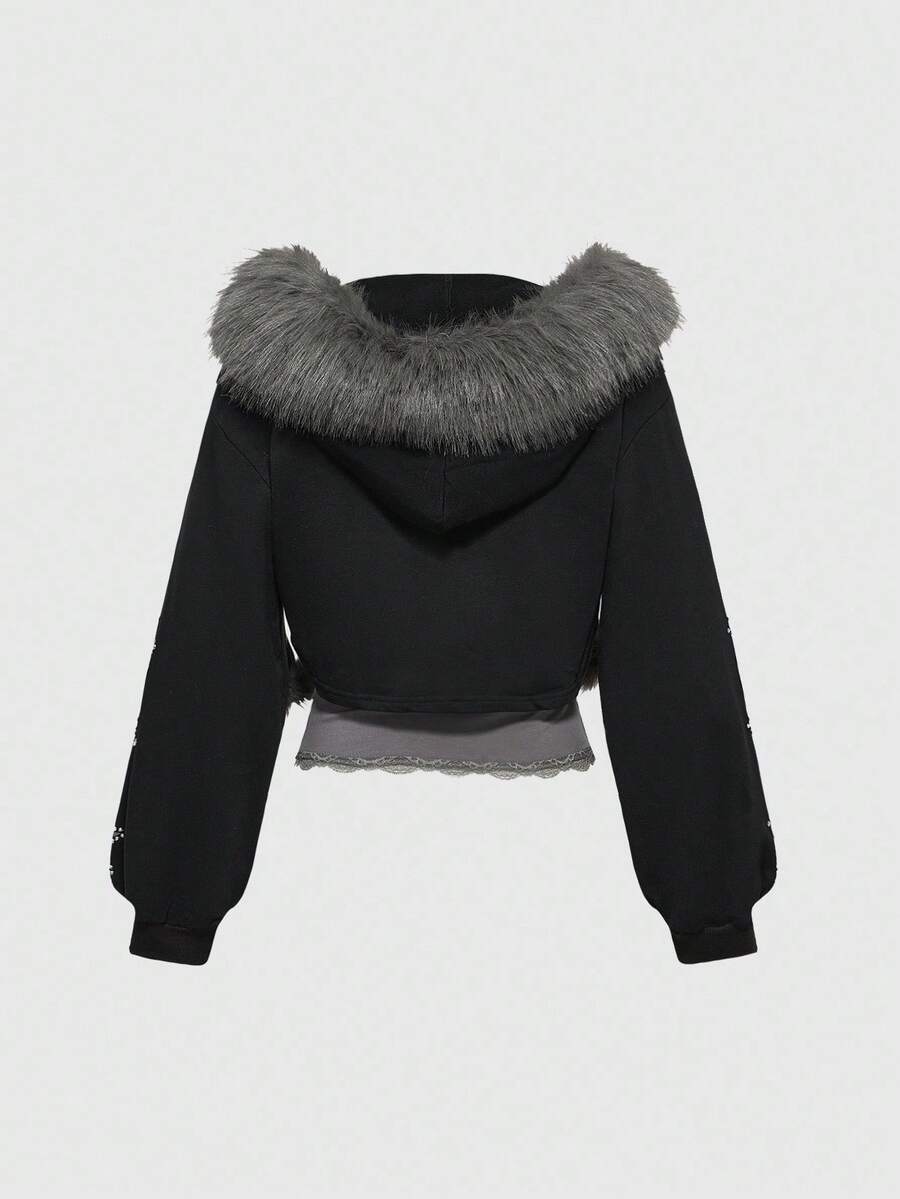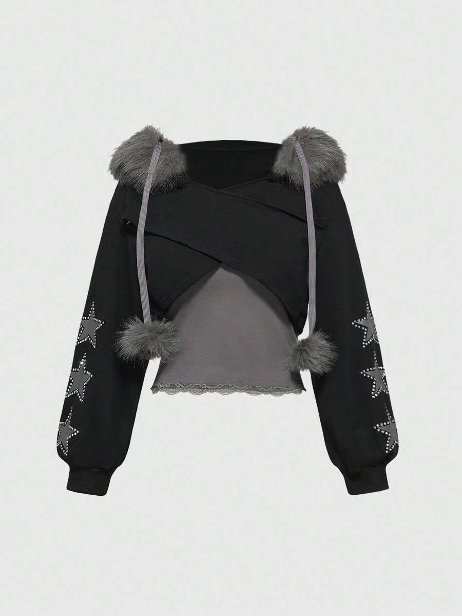 Fairycore Ensemble de sweat-shirt à capuche et gilet rétro Y2K avec patchwork de strass pour femmes