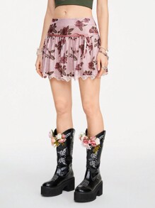 Fairycore Jupe d'été à dentelle contrastante et imprimé de fleurs pour femmes, avec ruban et détail de nœud
