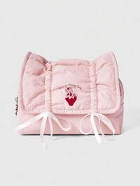 Kawaii Sac cosmétique en velours côtelé à motif double face nœud et cœur