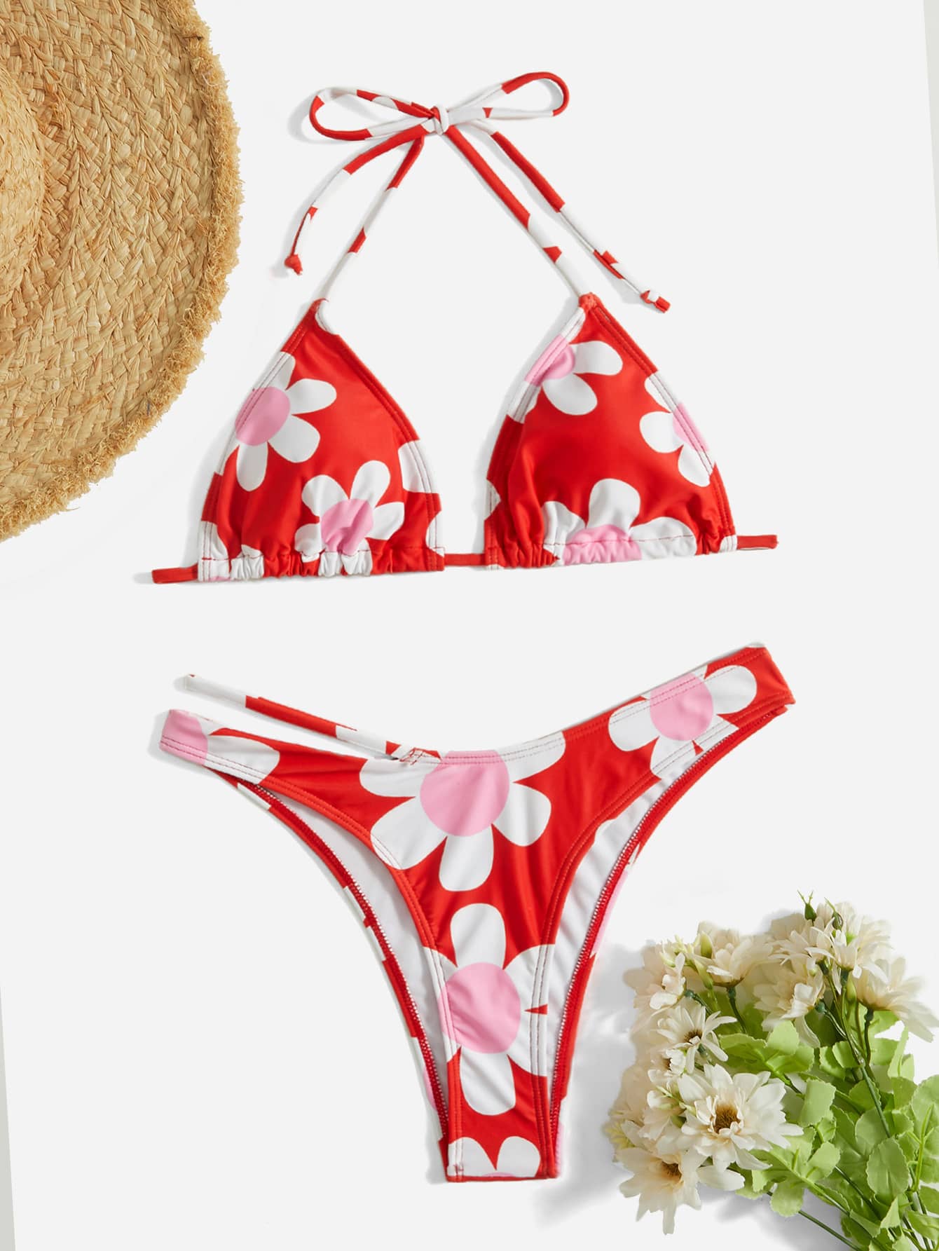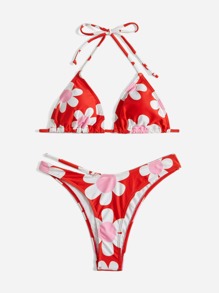 Bikini à fleurs avec décolleté ras-du-cou et découpes, pour les vacances à la plage en été