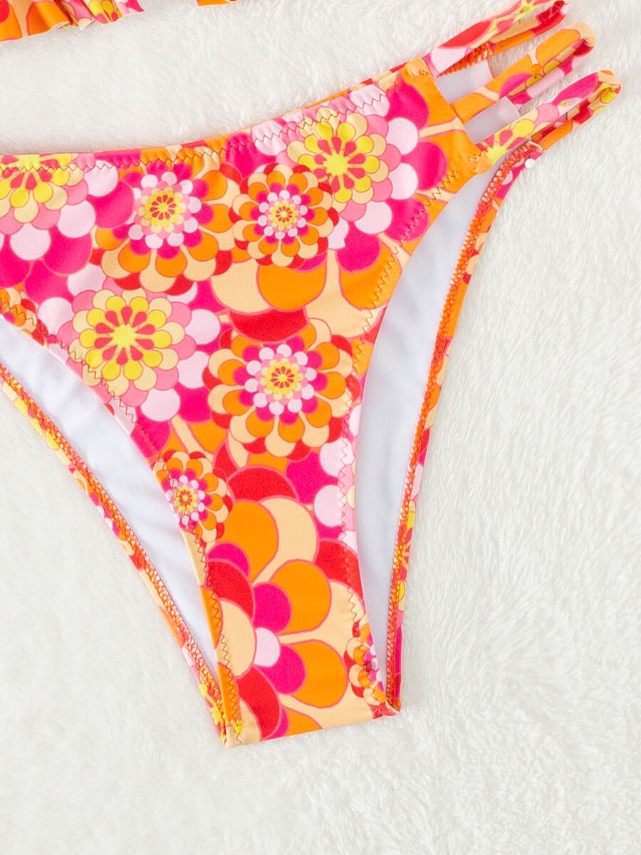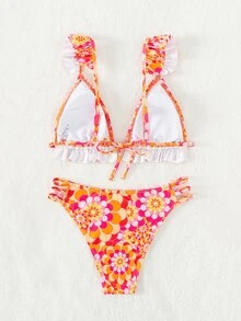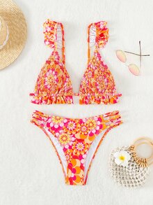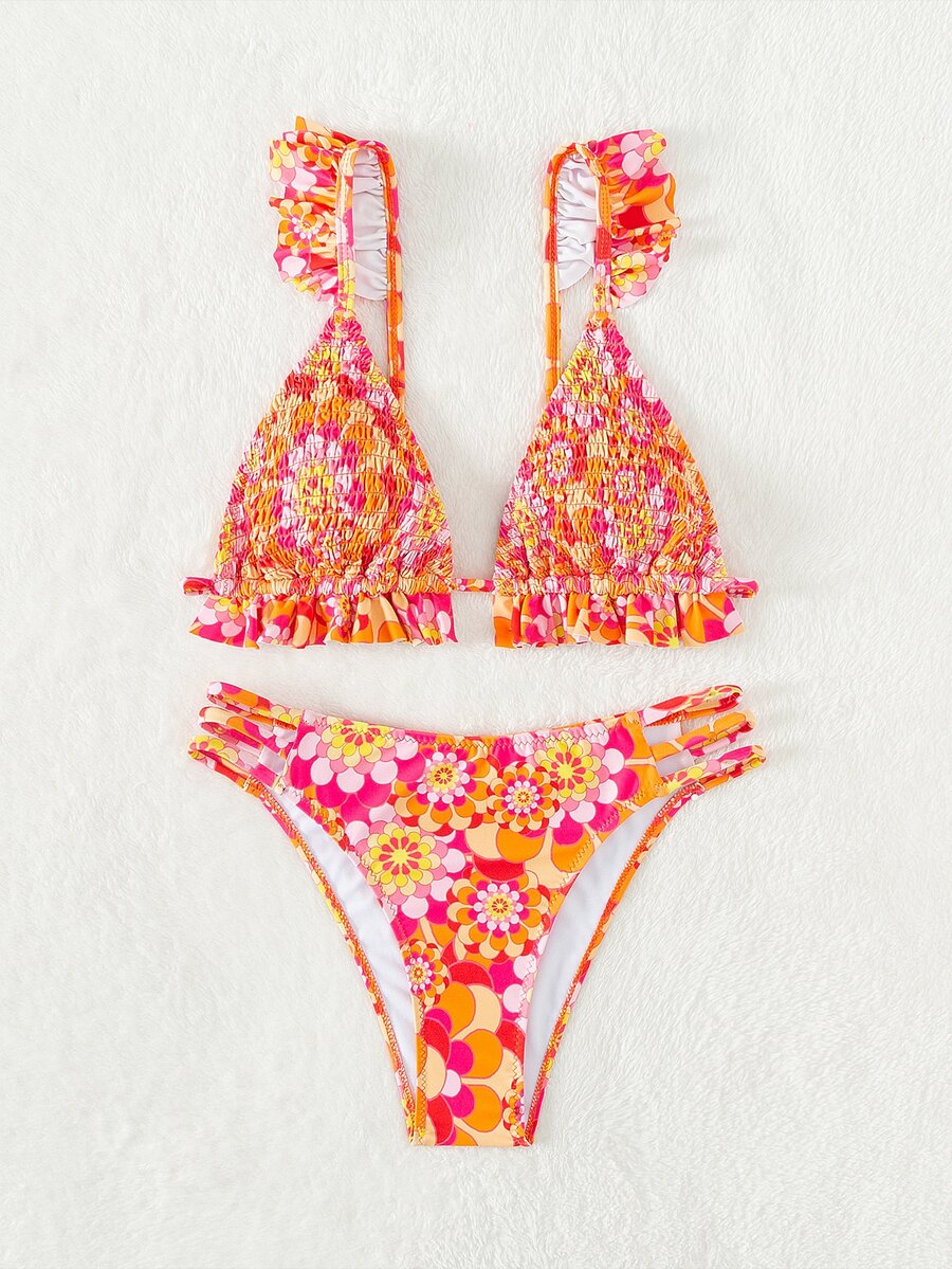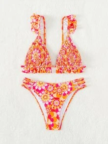 Ensemble de bikini d'été pour la plage à smocks avec garniture à volants et imprimé floral