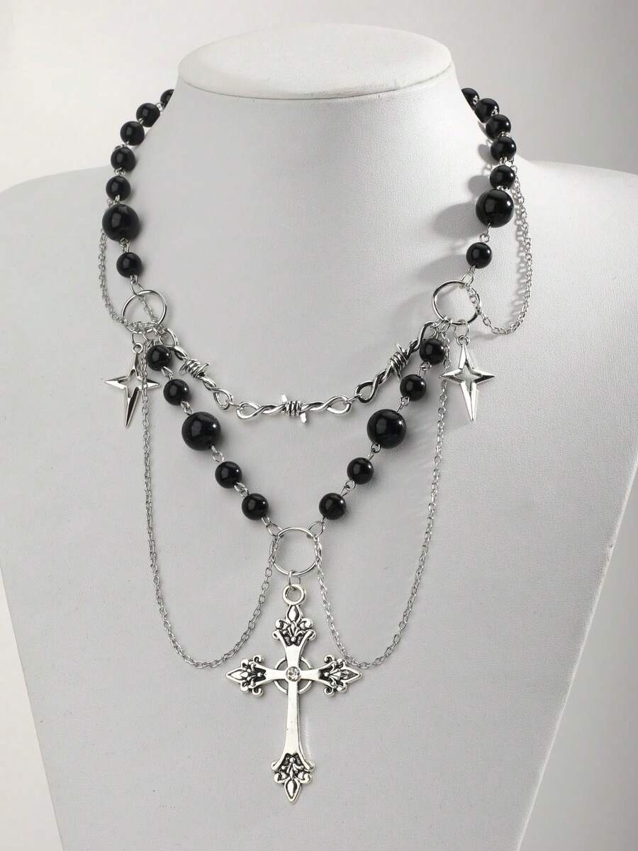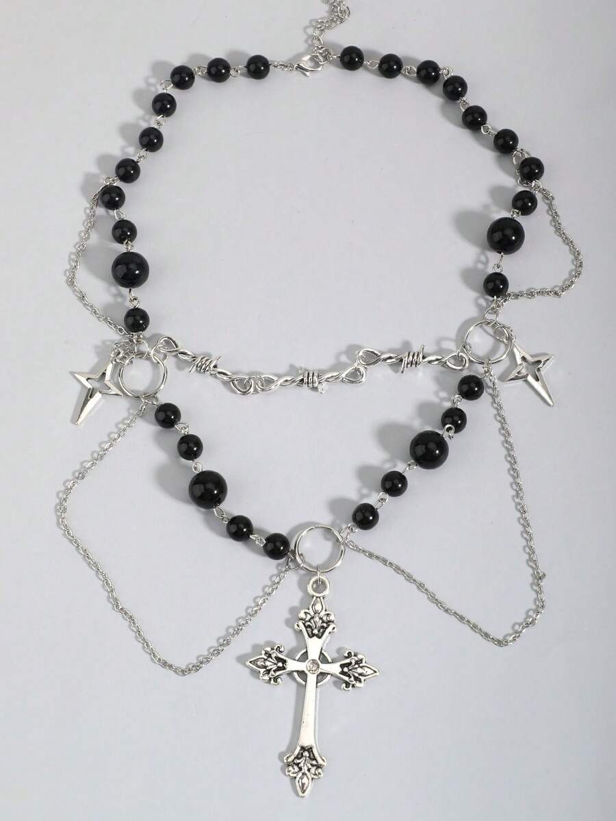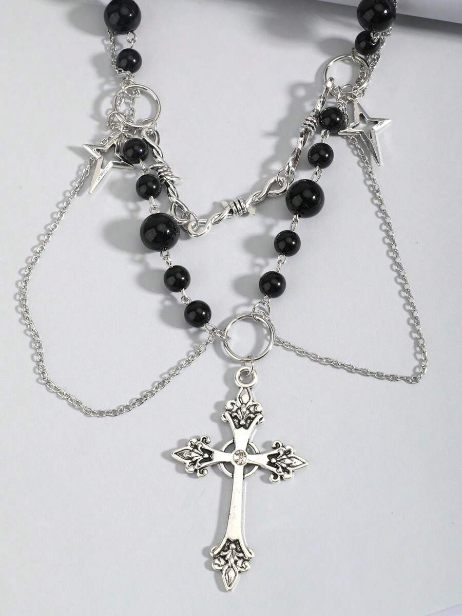 Goth 1 pièce Collier pendentif croix décoré de strass et de faux perles en alliage de zinc glamour pour femmes, pour la décoration quotidienne