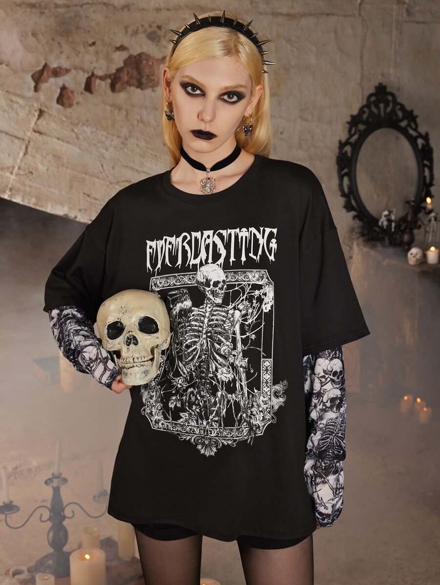 Goth T-shirt oversize 2 en 1 lettre à motif tête de mort