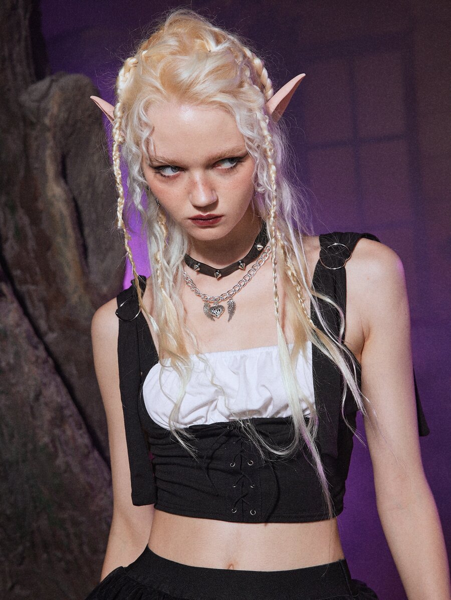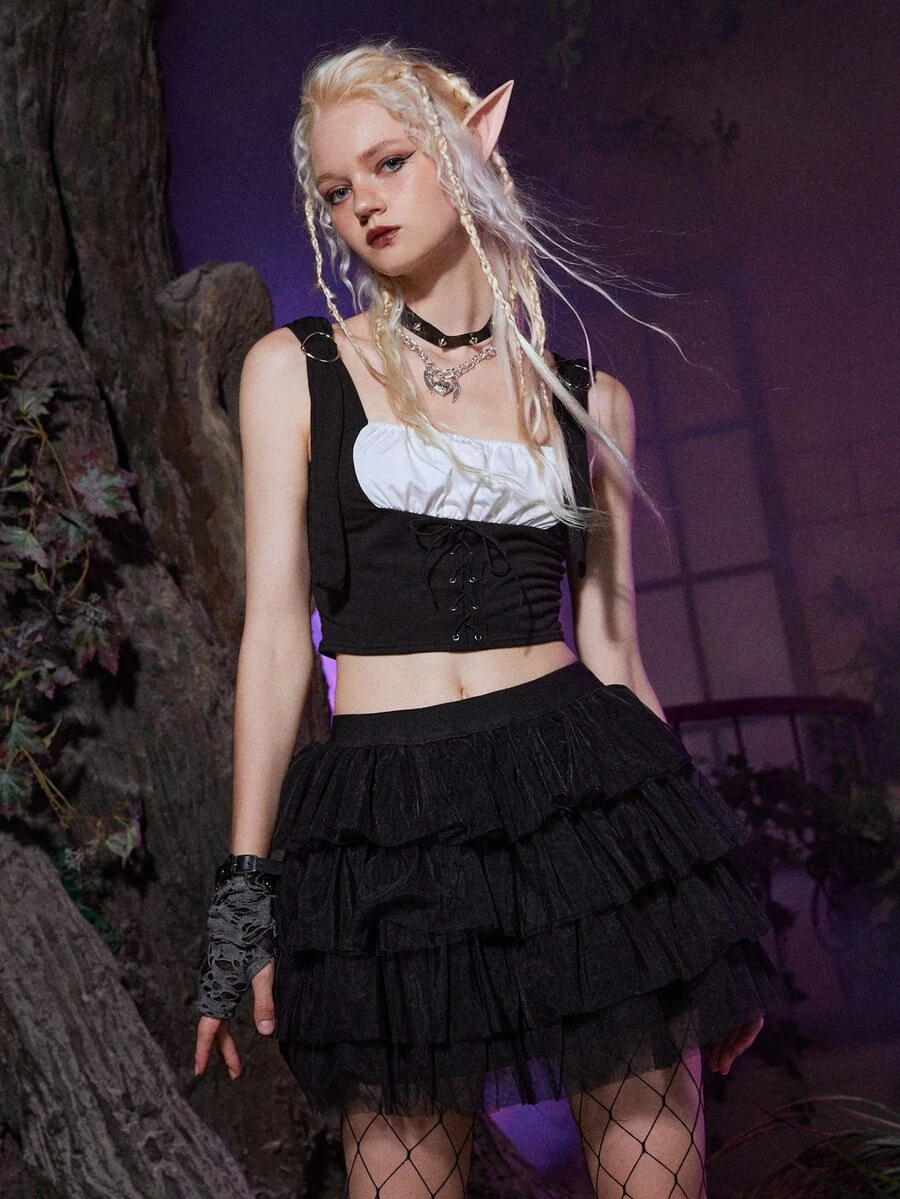 Goth Top à fines brides court 2 en 1 à ruchés à lacets