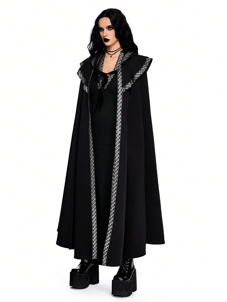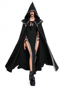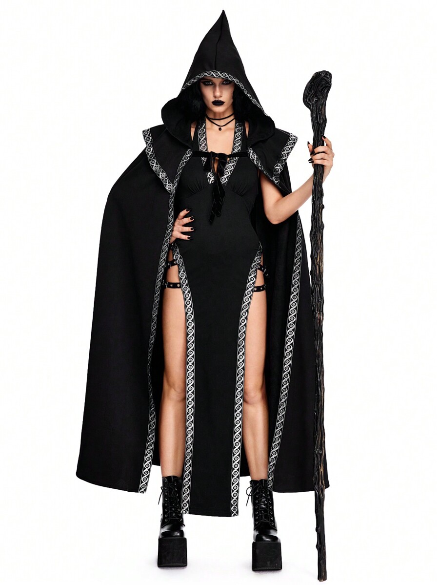 2 pièces Ensemble costume de cosplay pour femmes comprenant un chapeau de sorcière gothique, une cape et une robe vintage métallisée à fente élevée avec garniture de ruban