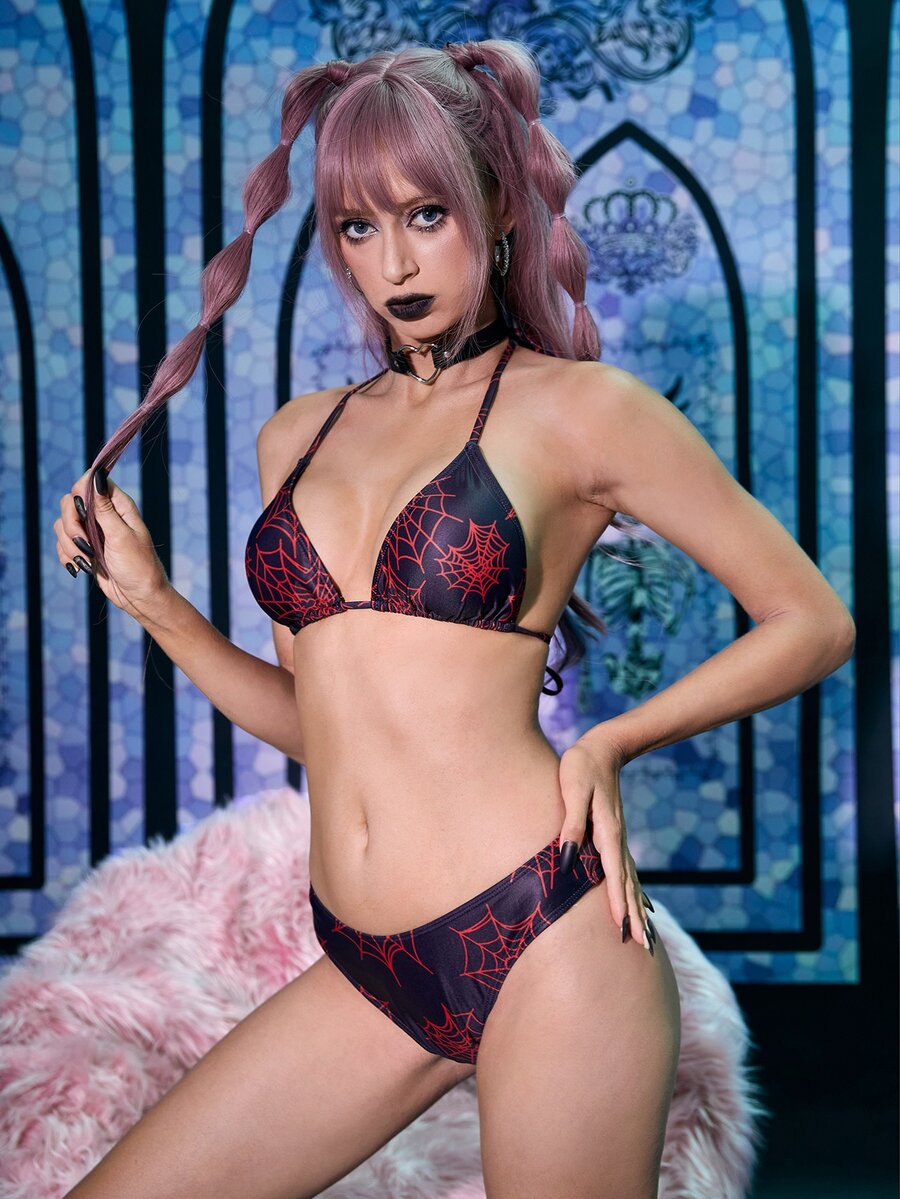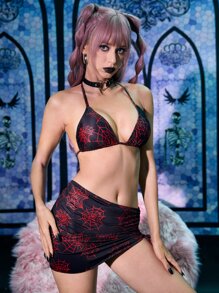 Goth 3 packs Bikini triangulaire graphique de toile d'araignée et jupe de plage