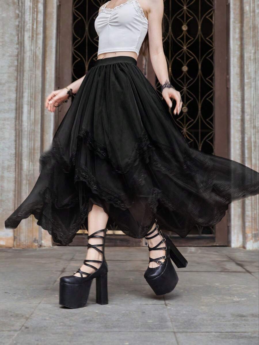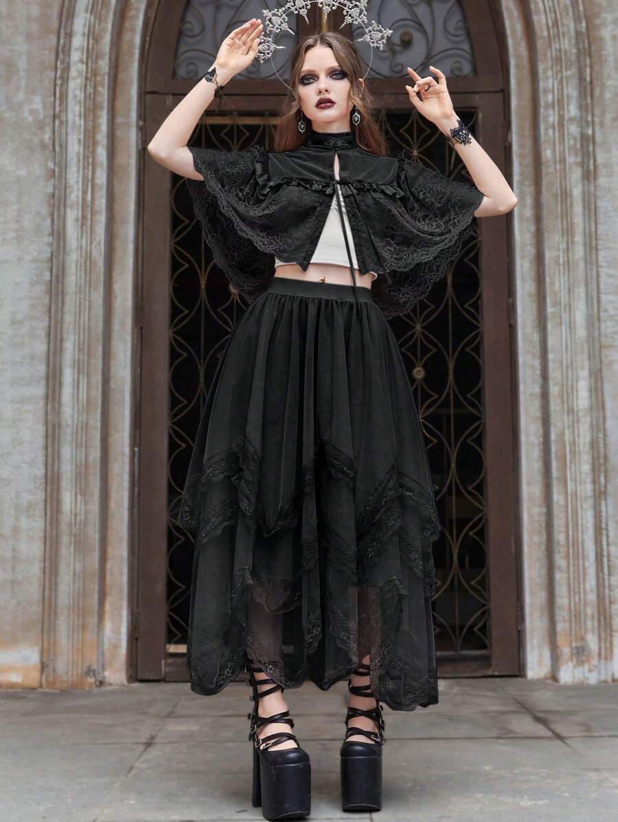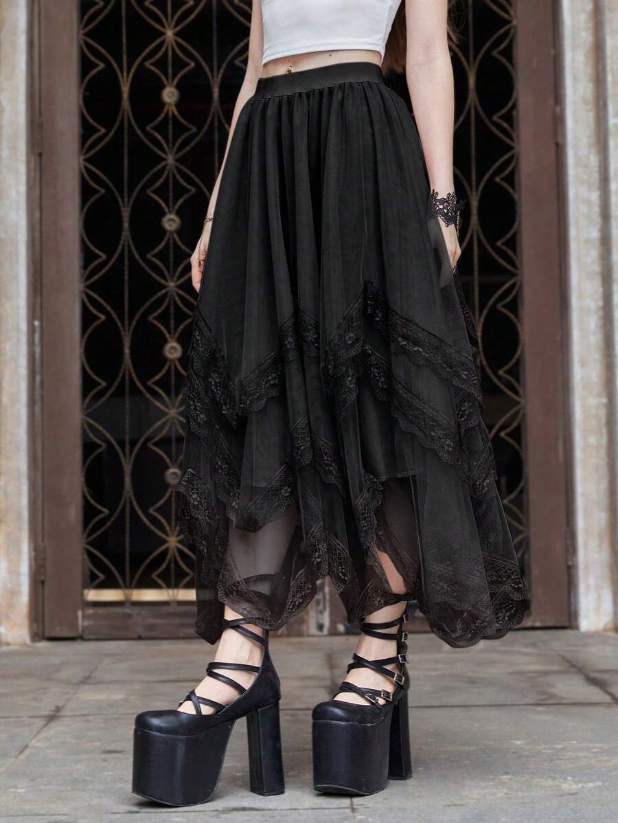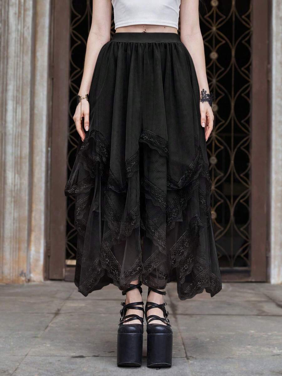 Goth Jupe asymétrique en patchwork de dentelle multicouche