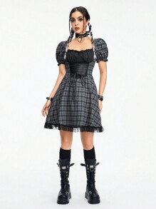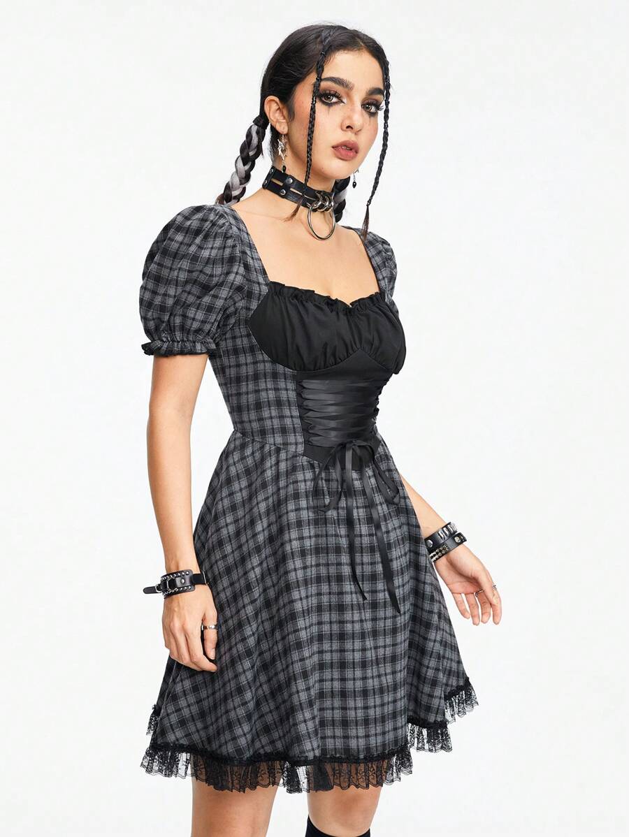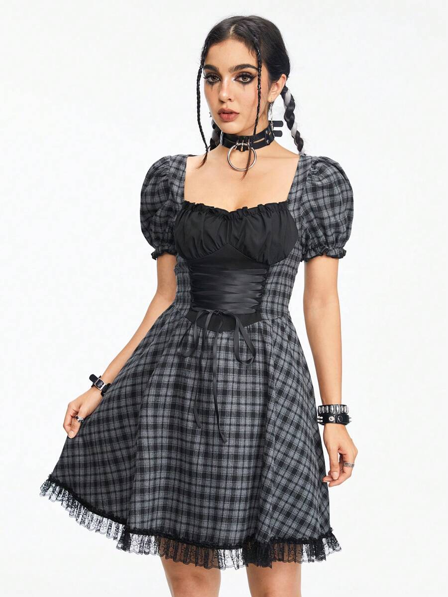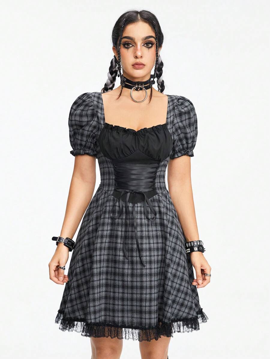 Goth Robe noire et grise à carreaux patchwork avec bordure en dentelle et taille cintrée pour femme