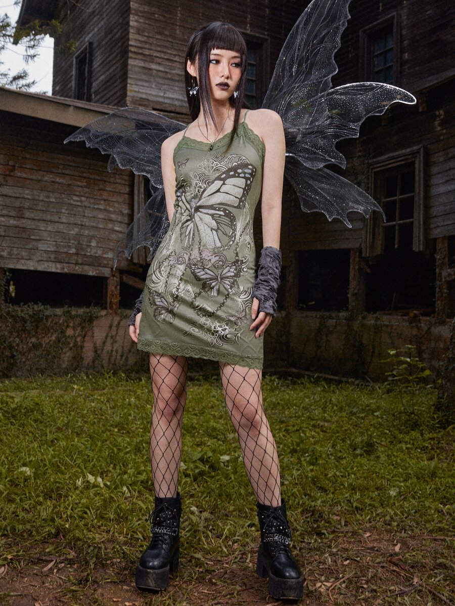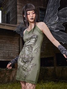 Goth Robe à fines brides à imprimé papillon en dentelle