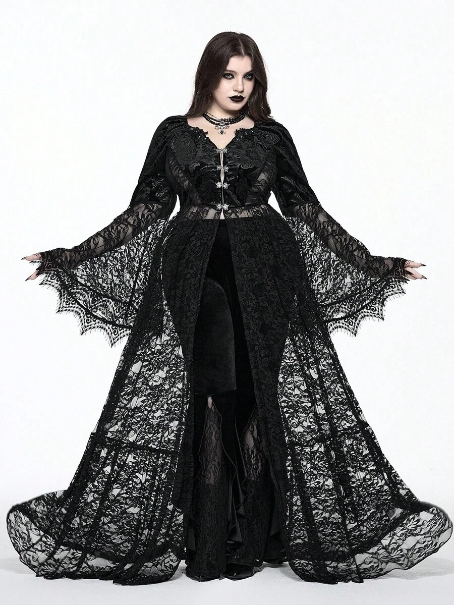 Robe ample pour femmes grande taille en velours jacquard gothique de Noël avec dentelle, manches évasées et ourlet ample. Peut être portée comme vêtement extérieur avec un pantalon ou une jupe