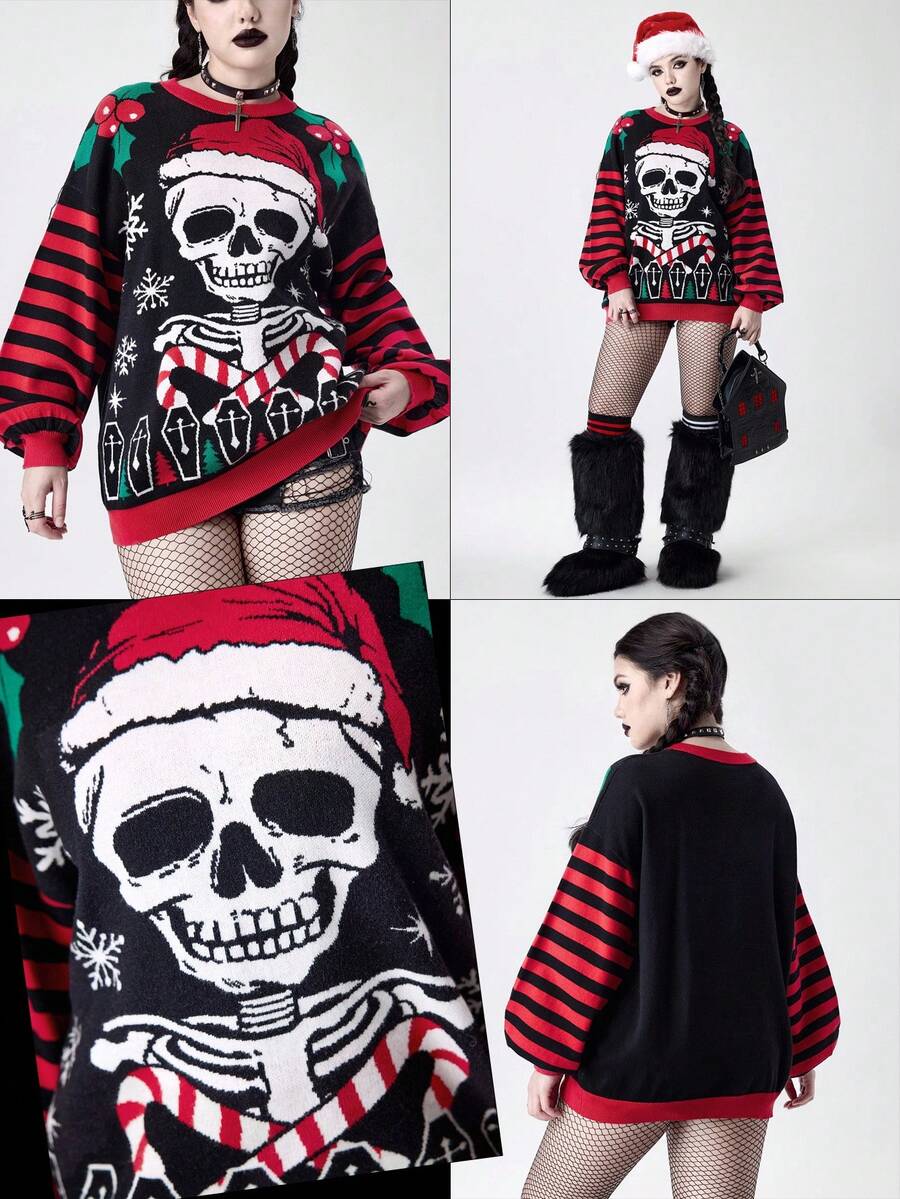 Goth Chandail pour femmes avec motif d'arbre de Noël sombre, de crâne, de flocon de neige et de canne en bonbon