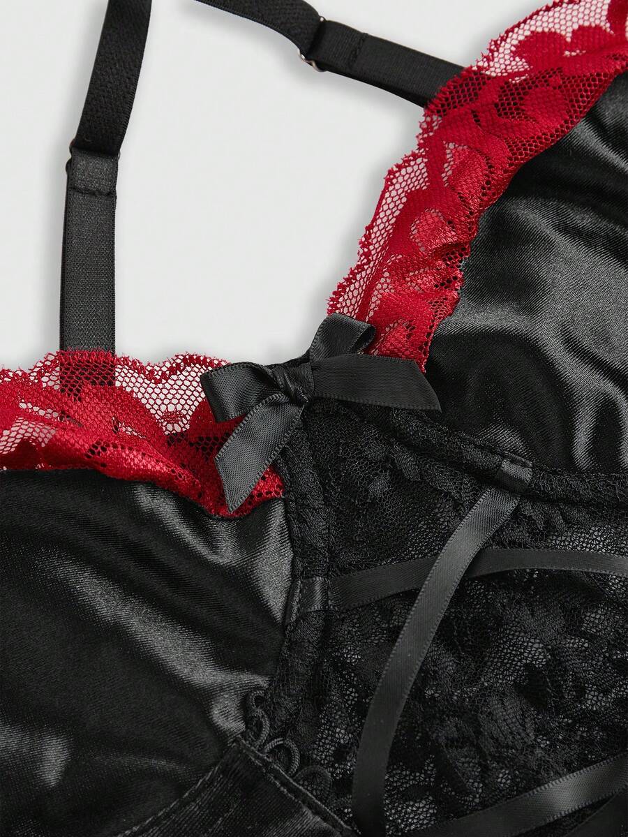 Brassière rembourrée avec dentelle à laçage devant, ornée d'un nœud, dans un style gothique foncé contrasté