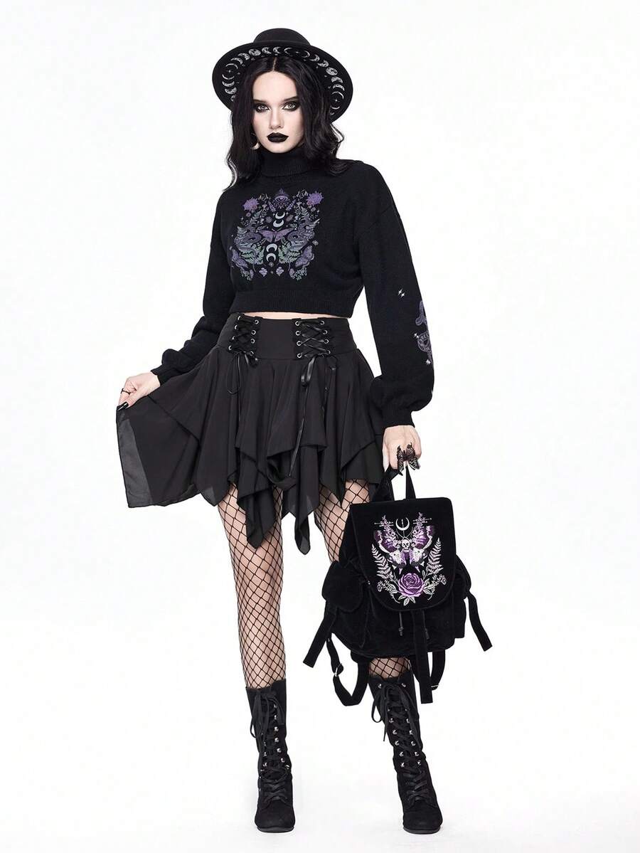 Goth Pull court à col montant pour femmes, top tricoté à manches bouffantes avec motif vintage mystérieux de motif de peau de serpent et de papillon, automne/hiver