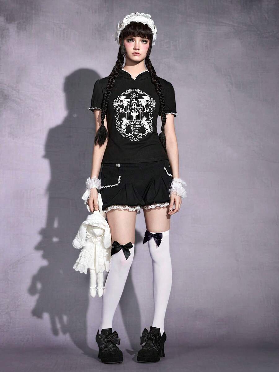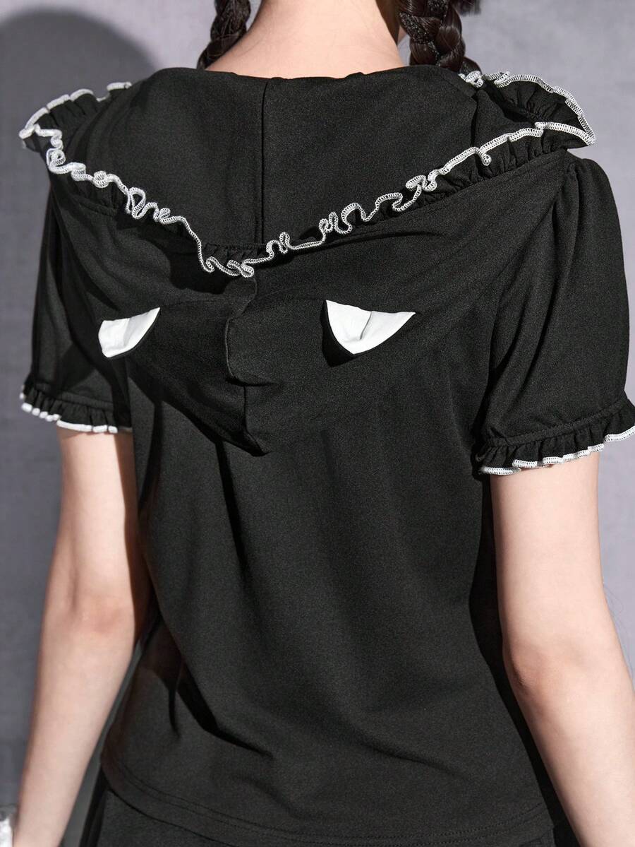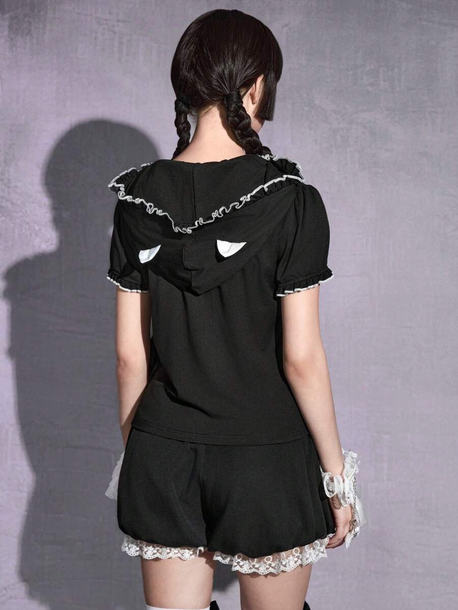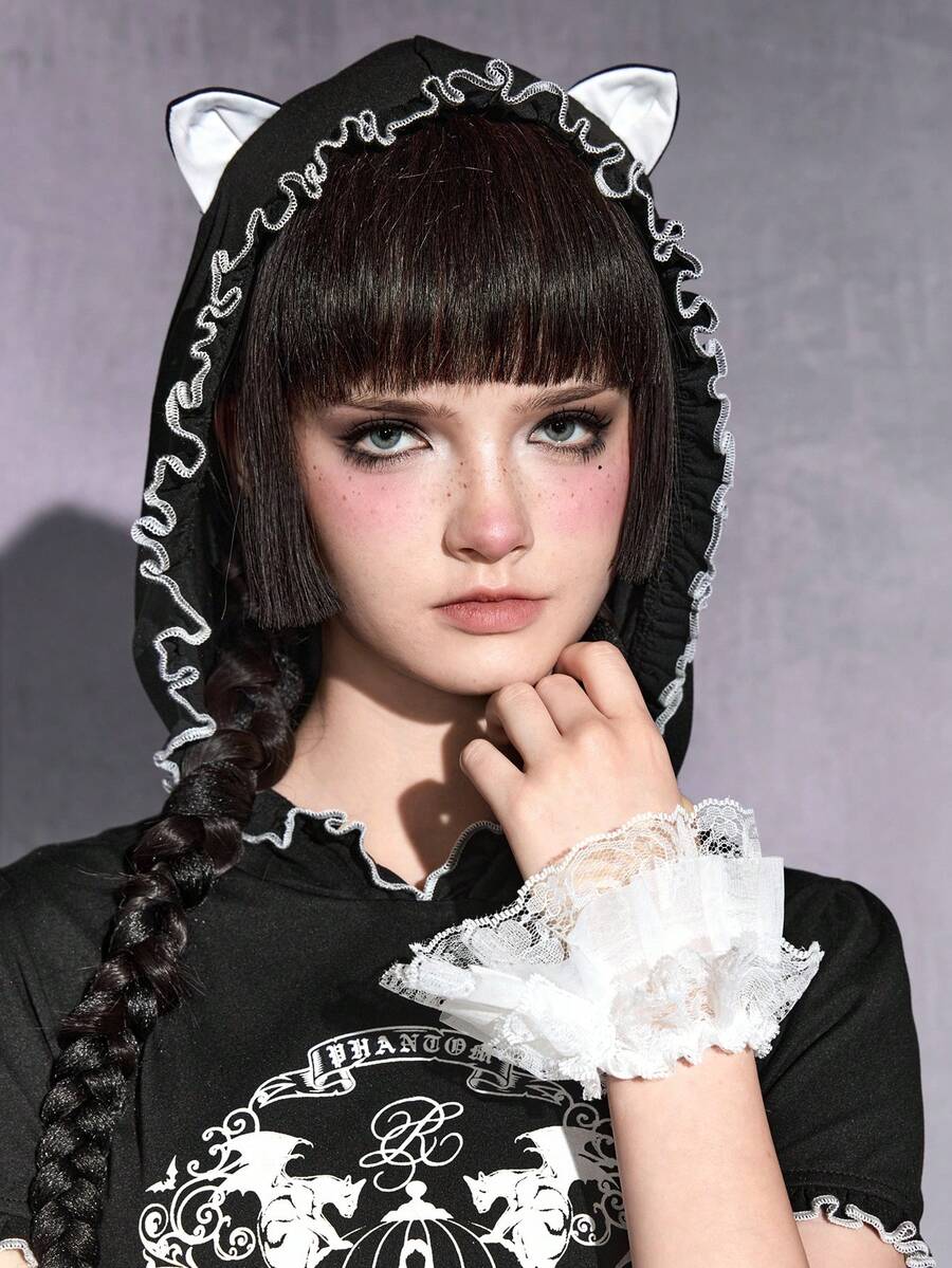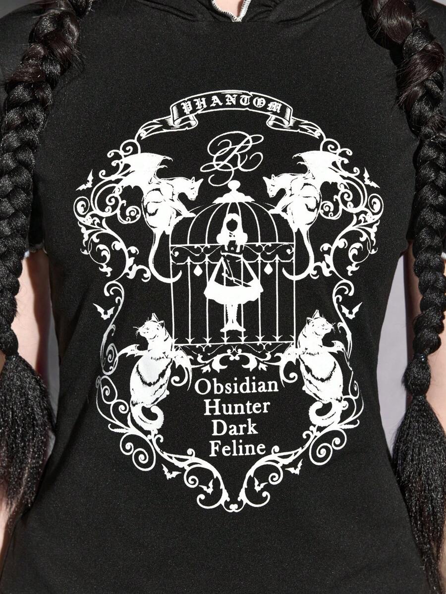 Goth sweat-shirt à capuche avec silhouette de fille, cage à oiseaux, ailes de chauve-souris, chat et vigne sombre, avec oreilles de chat. T-shirt moulant.