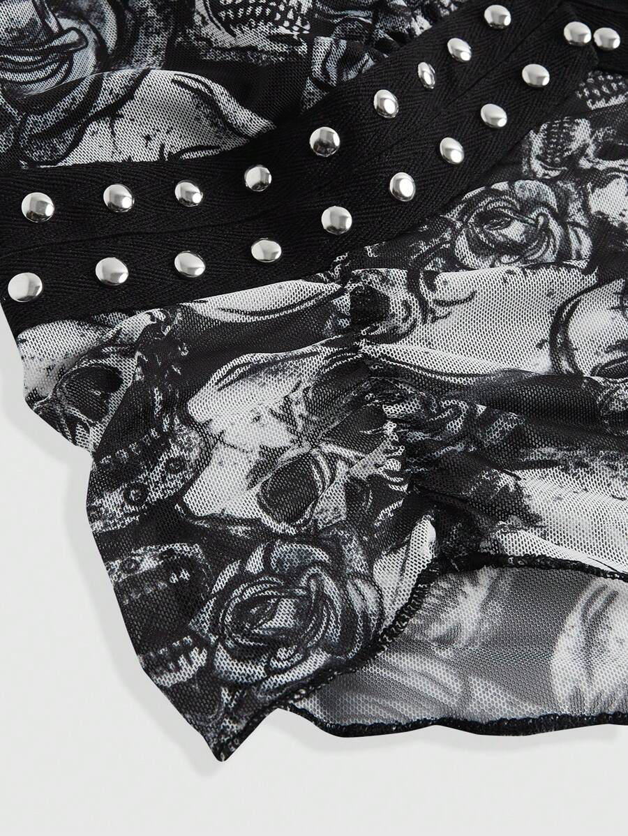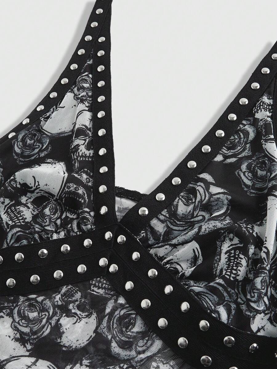 Débardeur pour femmes de style Gothique et Punk avec imprimé floral de crâne et de rose avec des clous en métal et un design de taille perspectivale