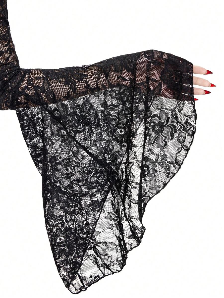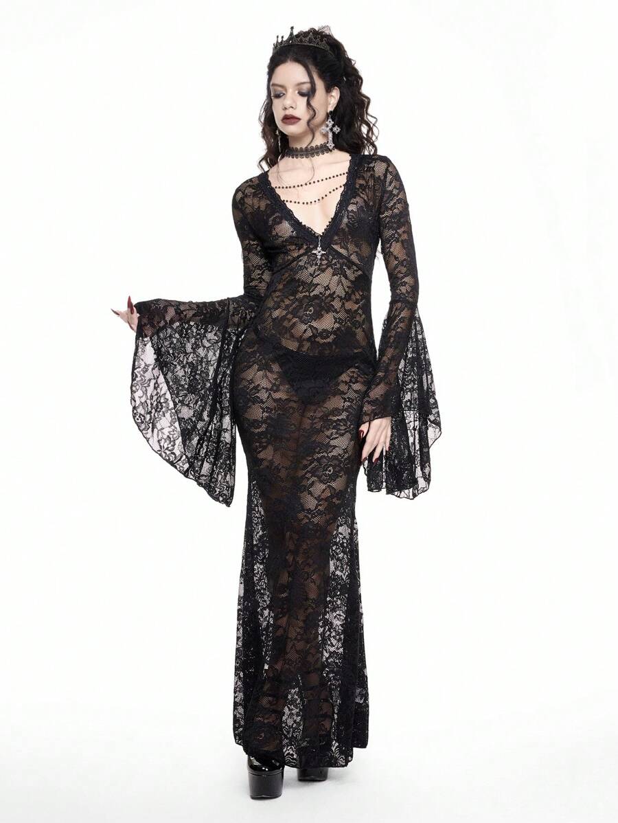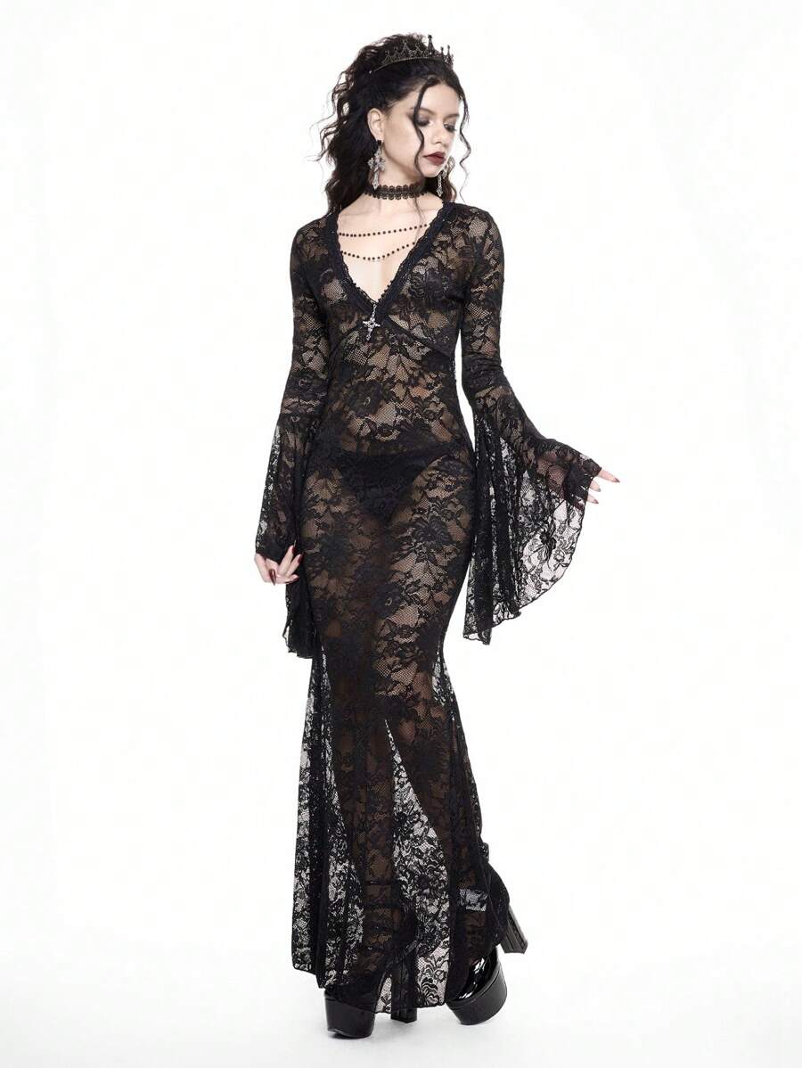 Robe maxi gothique sexy pour la Saint-Valentin, à col en V profond, en croix et perles, dentelle semi-transparente et à queue de poisson
