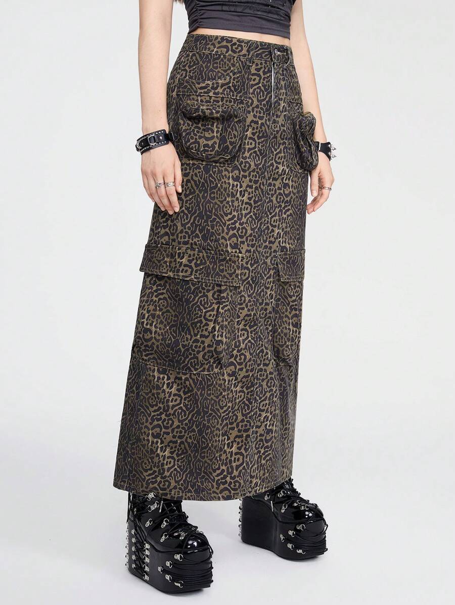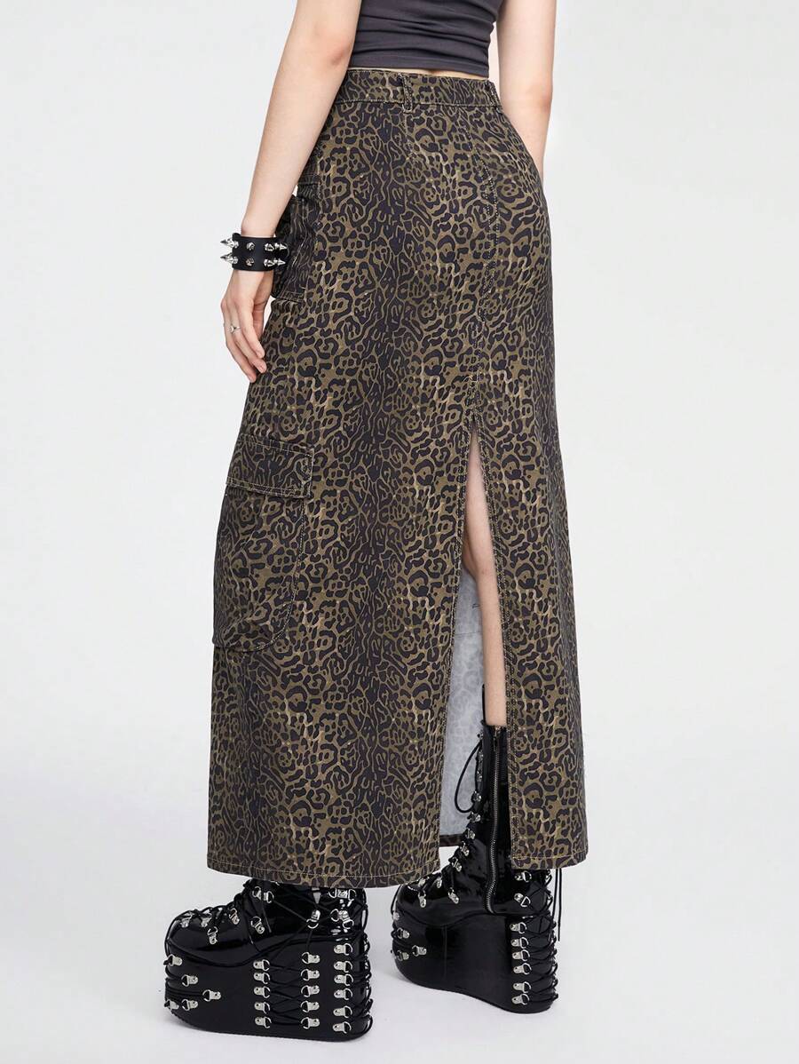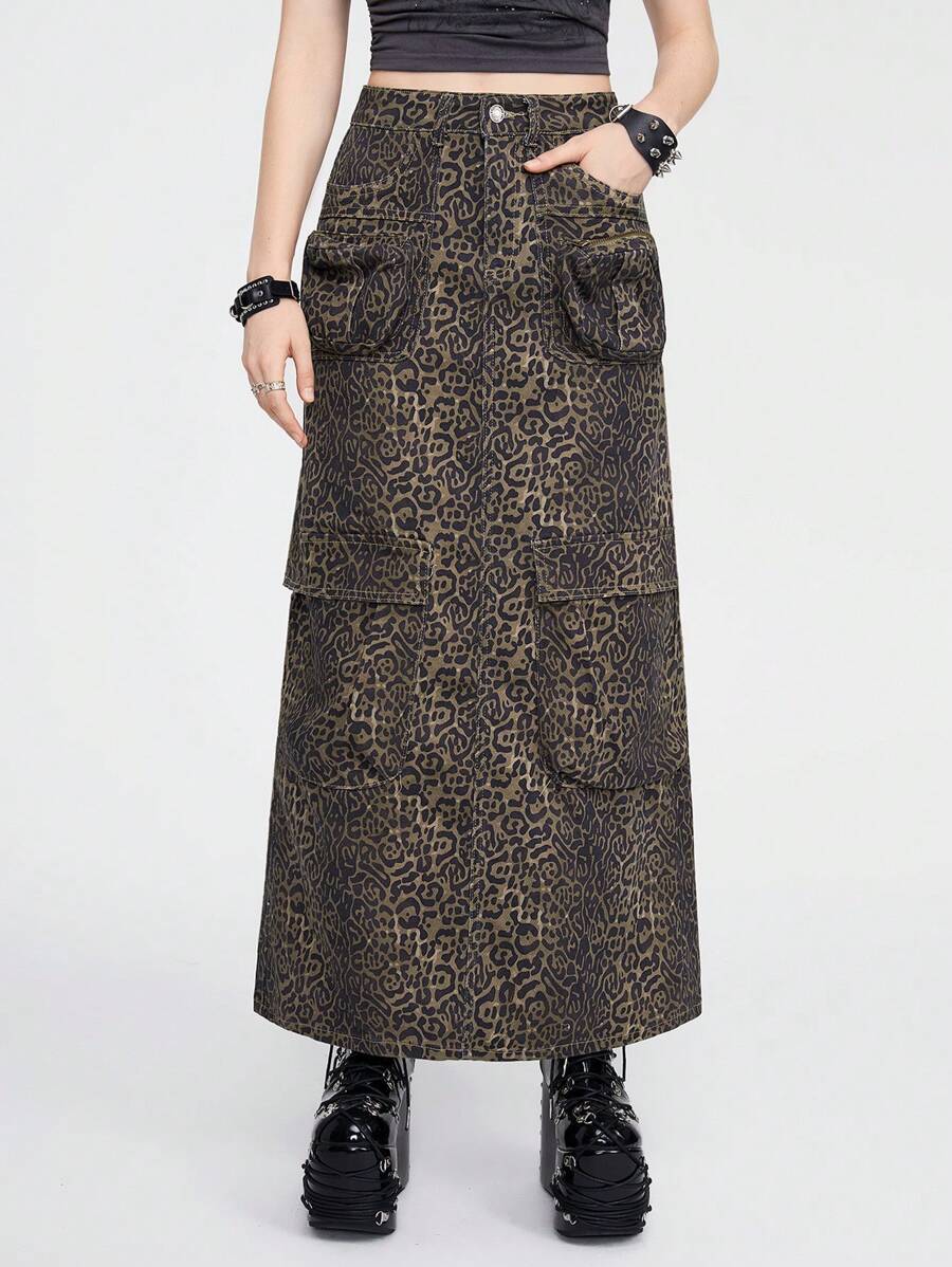 Goth Jupe en denim à poches à rabat à imprimé léopard