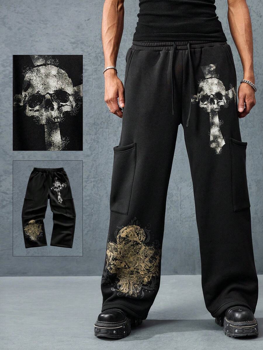 Goth Pantalon décontracté pour hommes avec imprimé squelette et cordon de serrage à la taille, automne