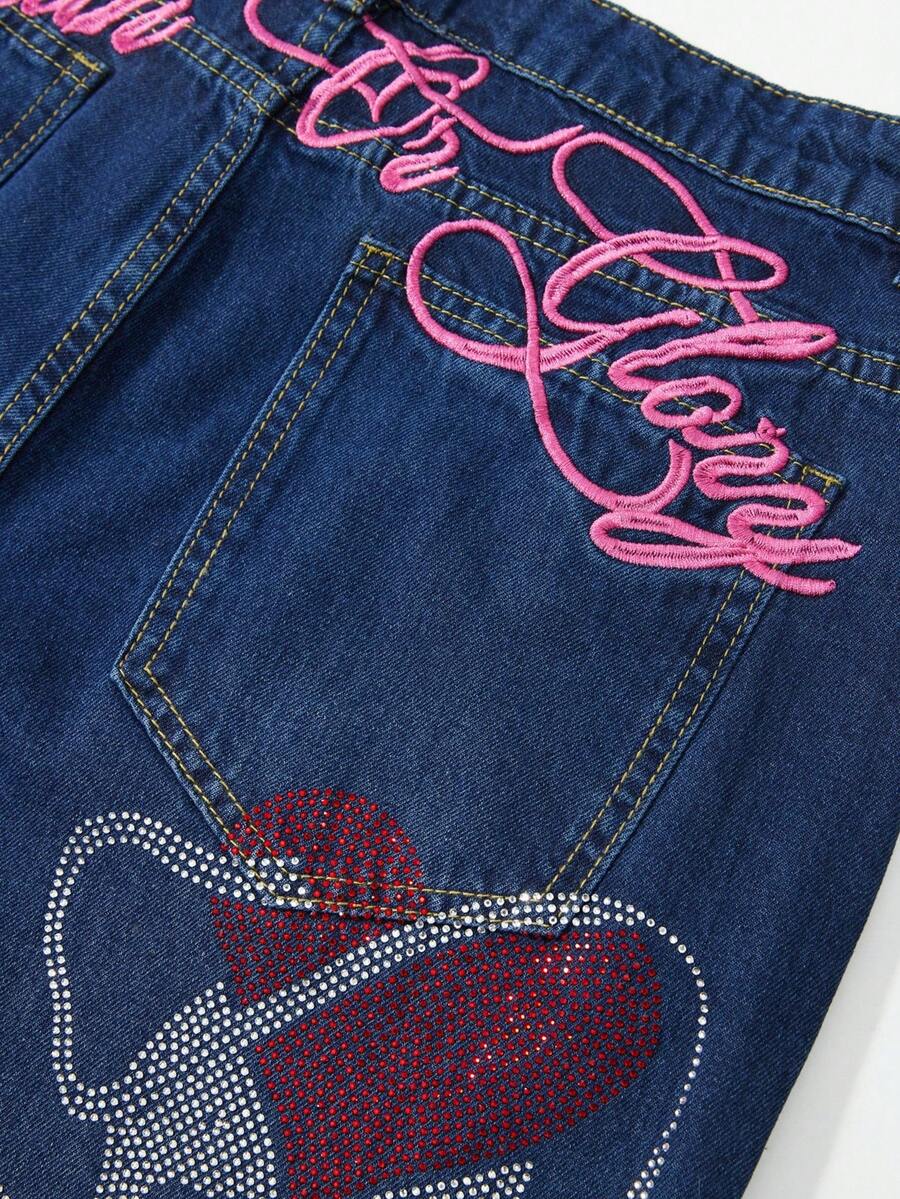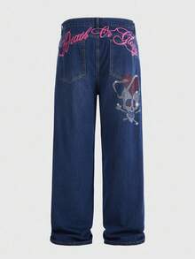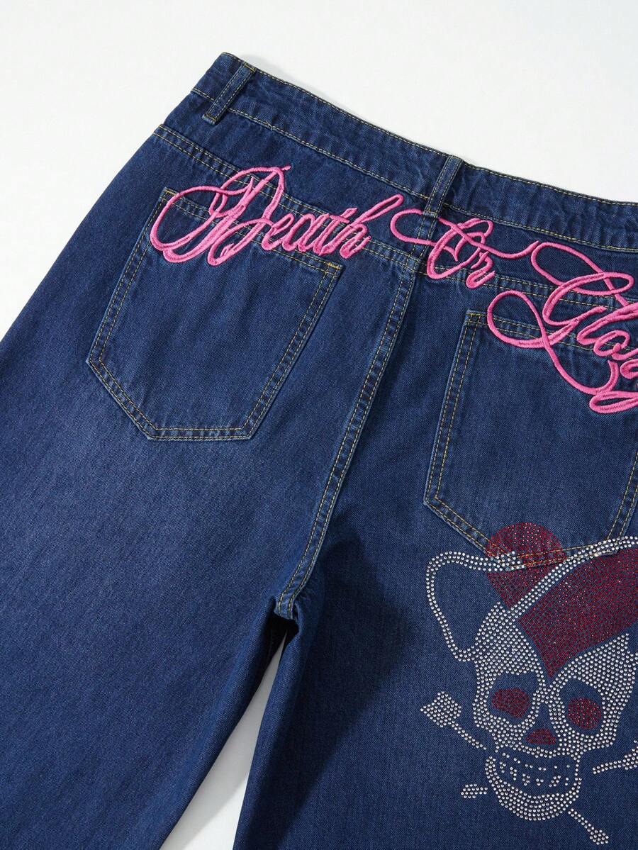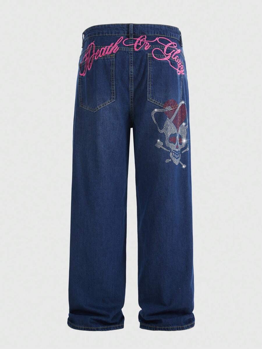 Goth Jeans en denim délavé décontracté pour hommes avec tête de crâne, strass et broderie de lettre