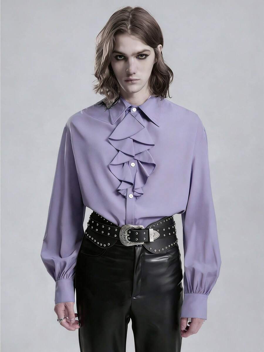 Goth Chemise à manches longues avec boutons et volants de couleur unie pour hommes