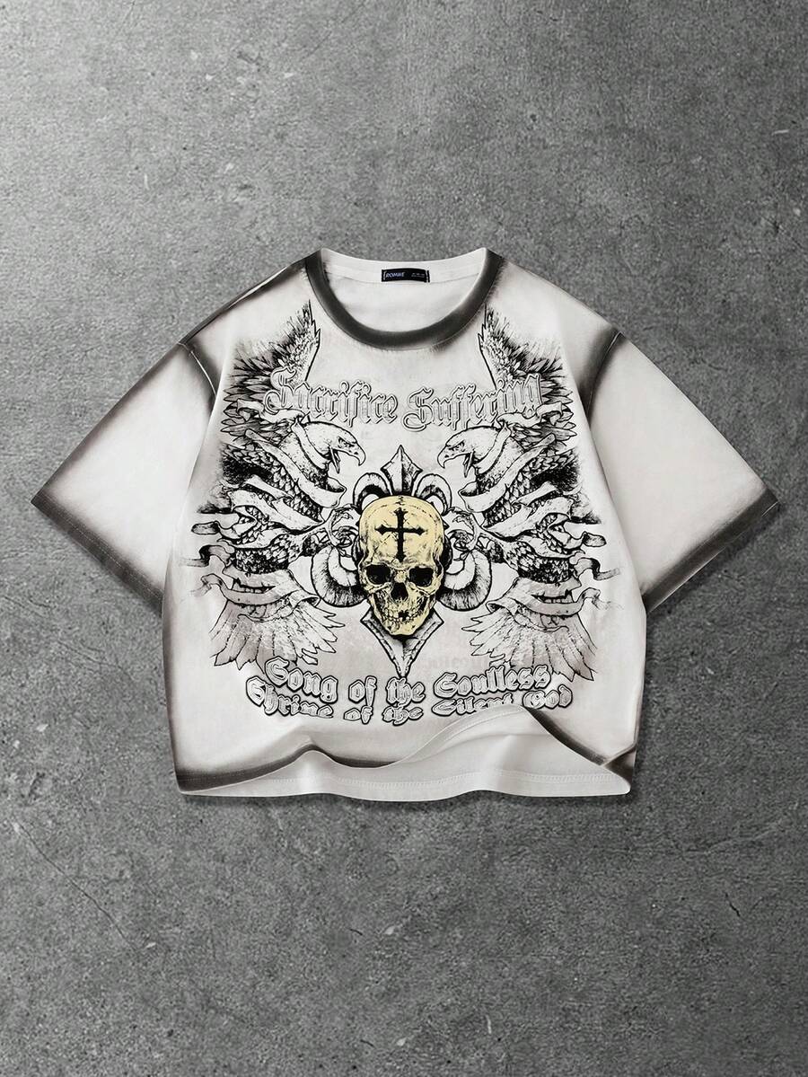 Goth T-shirt ample à manches tombantes avec slogan peint à la main et motif crâne pour hommes