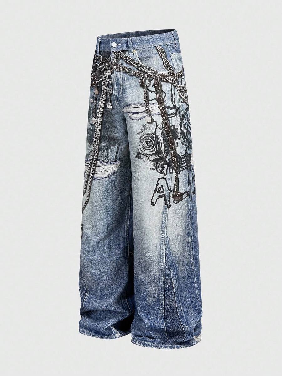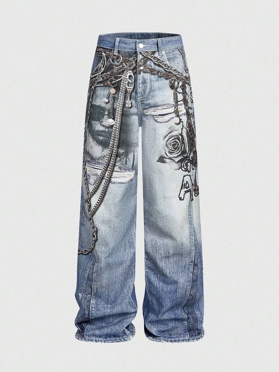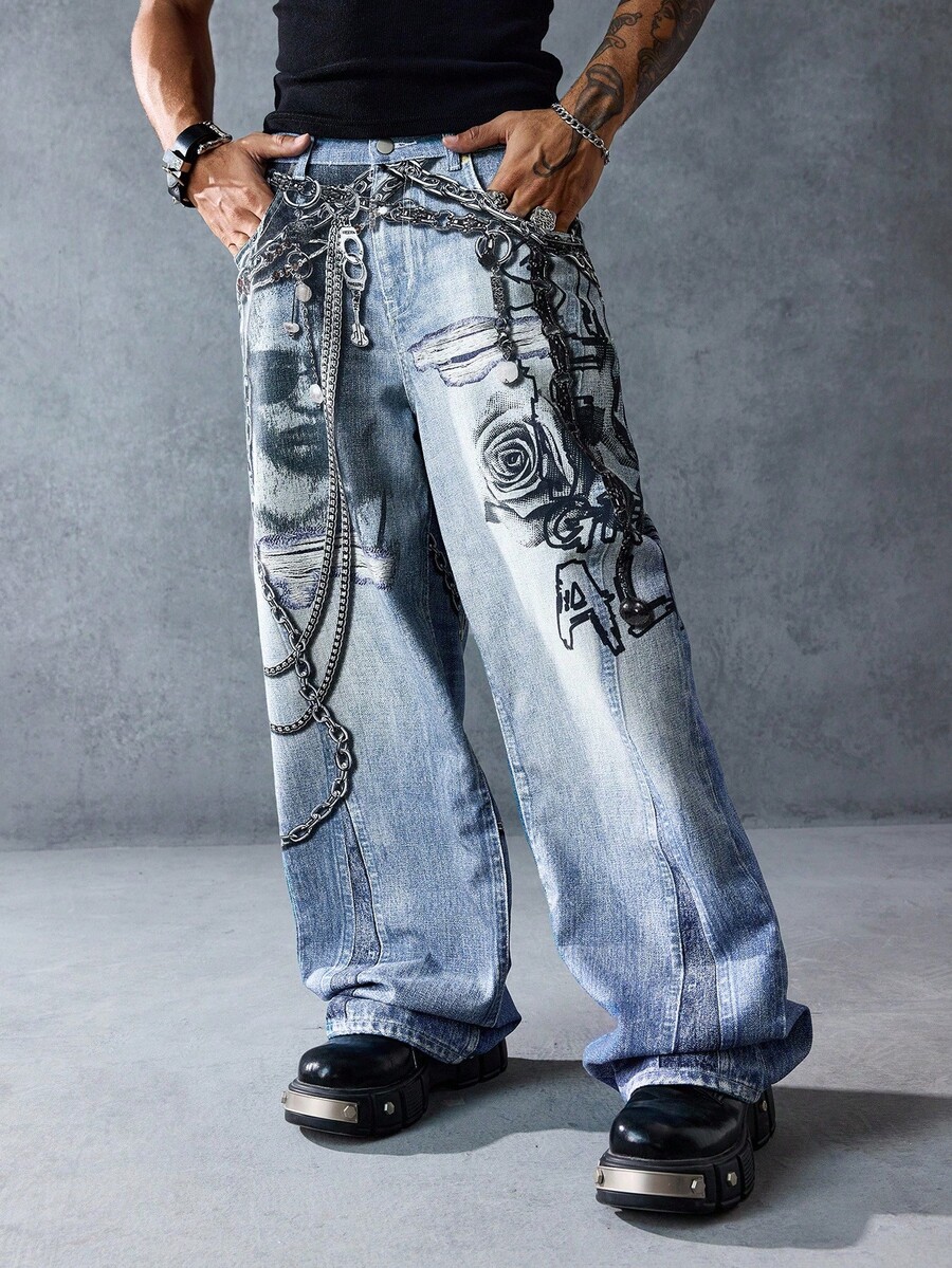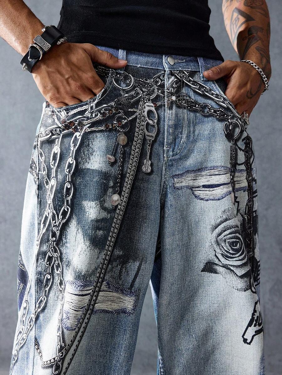 Goth Jeans mode de rue ample avec motif de chaîne de jambe large pour hommes