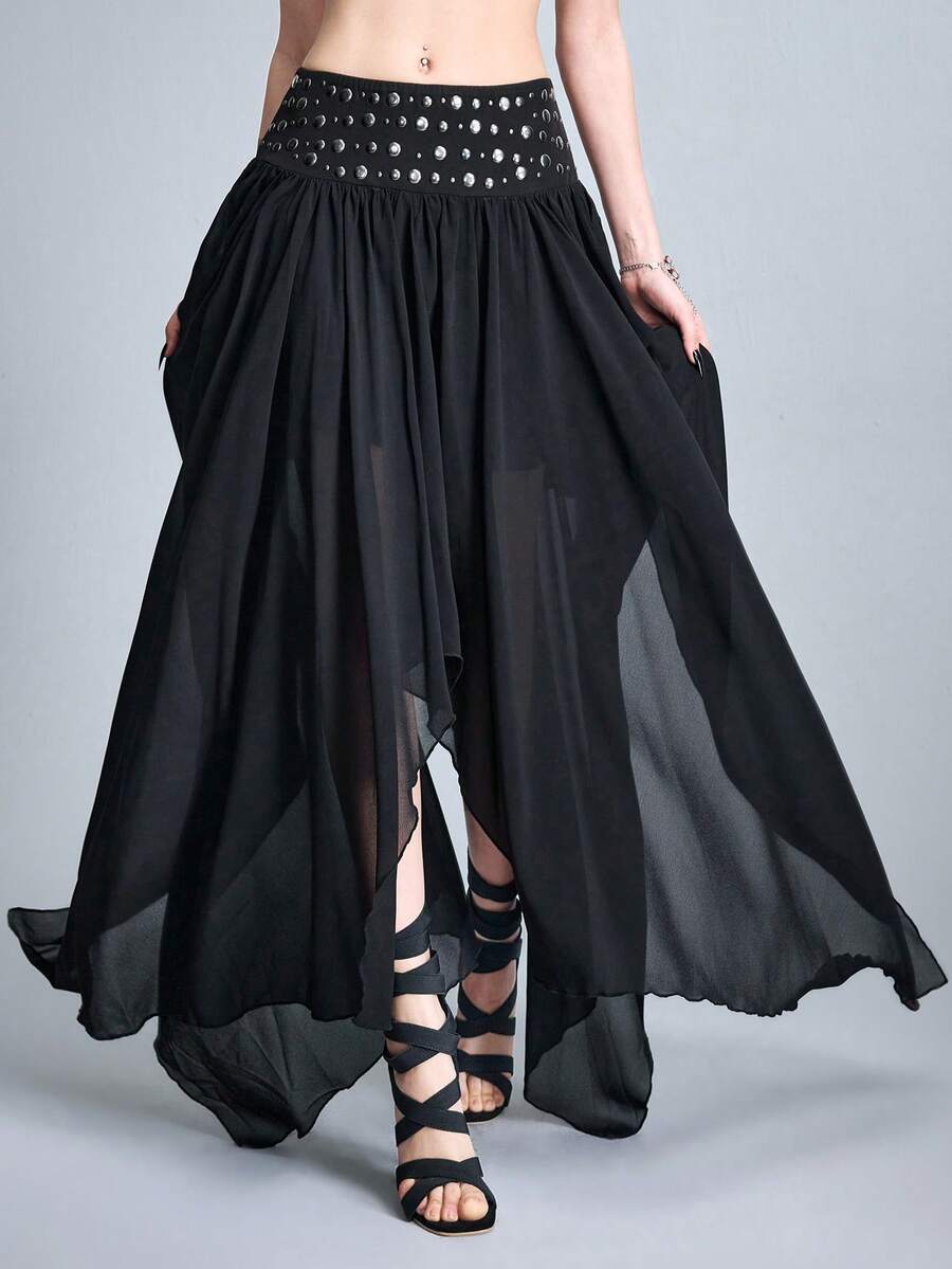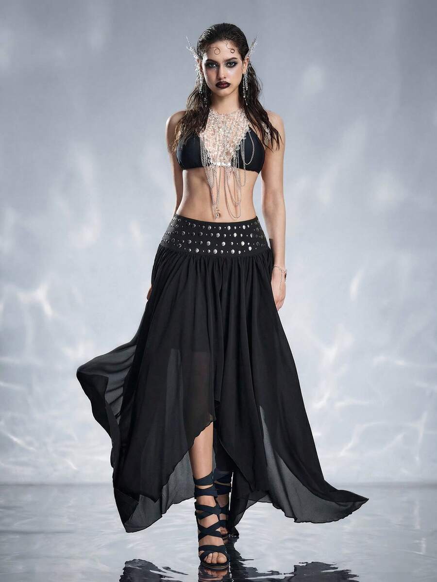 Goth Jupe longue asymétrique avec rivets en métal