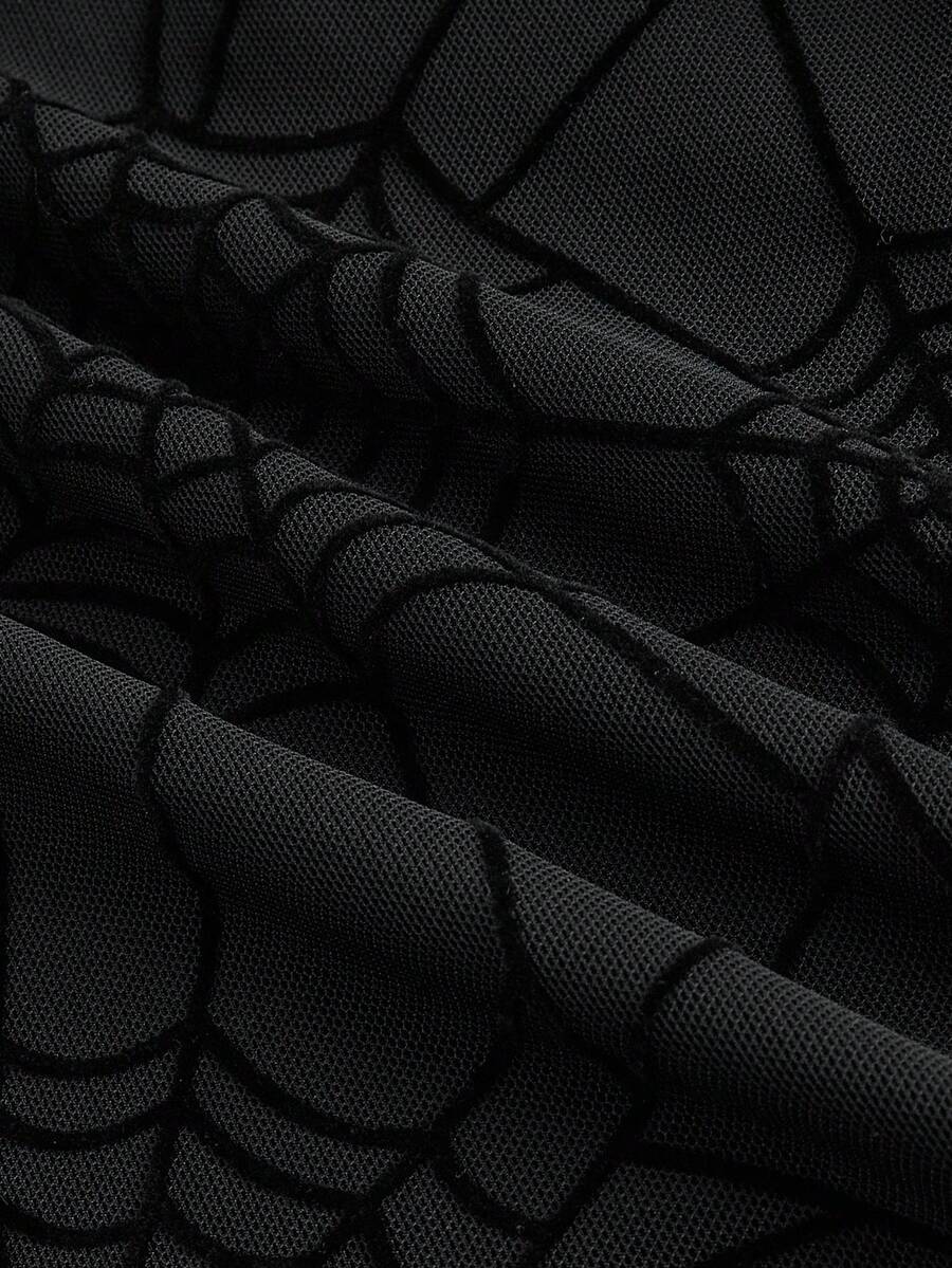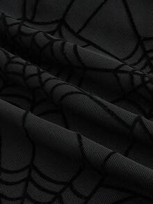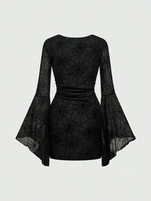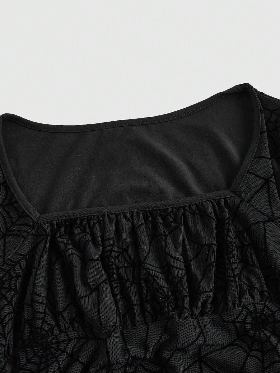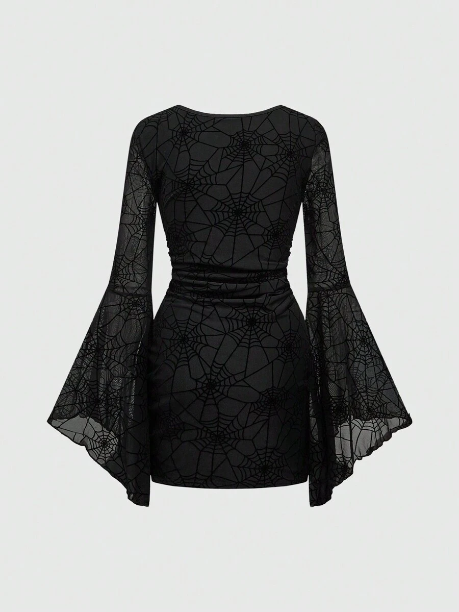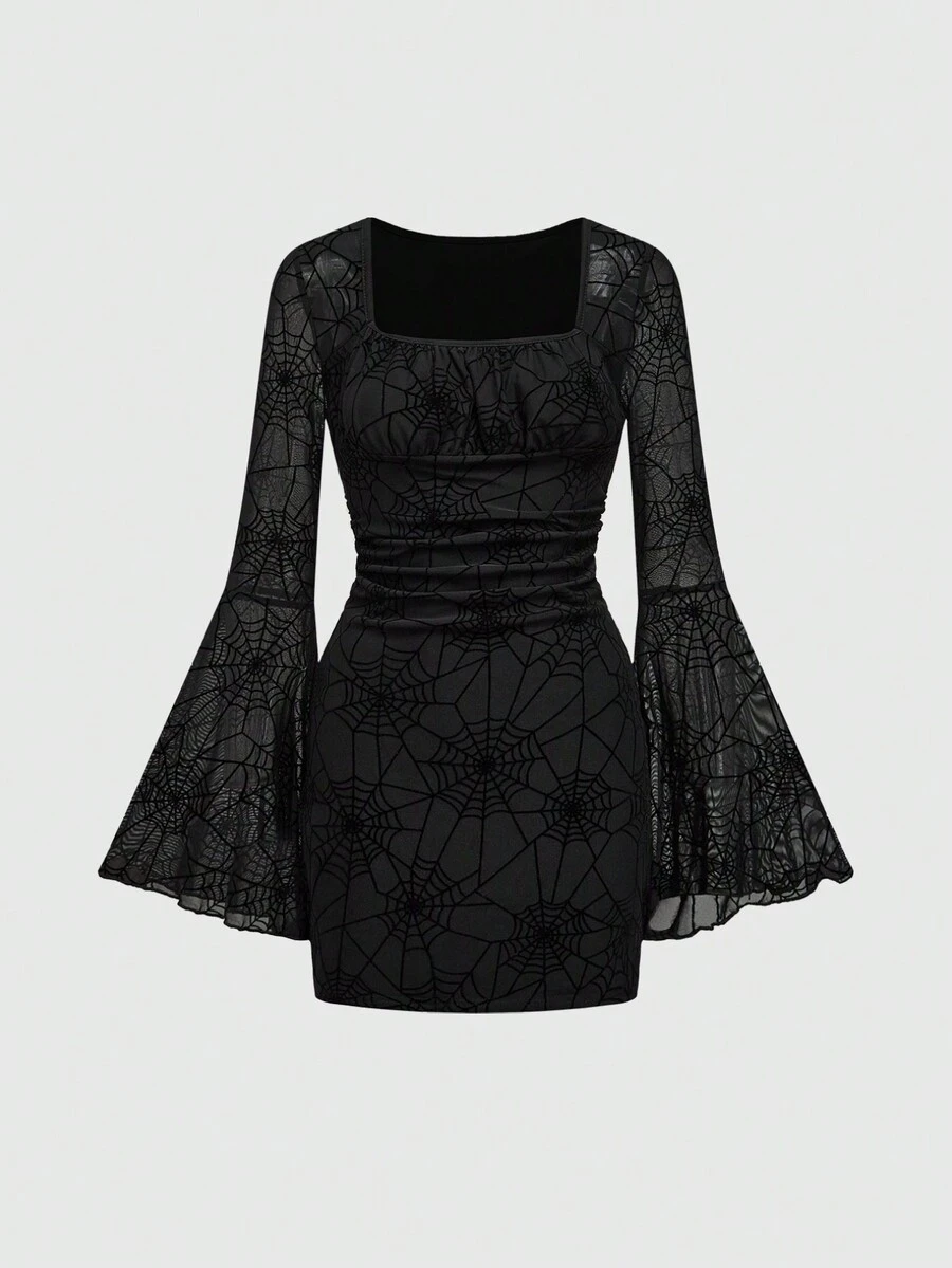 Goth Robe courte élégante et romantique pour femmes avec encolure carrée, manches évasées et motif de toile d'araignée mystérieux et sombre pour Halloween