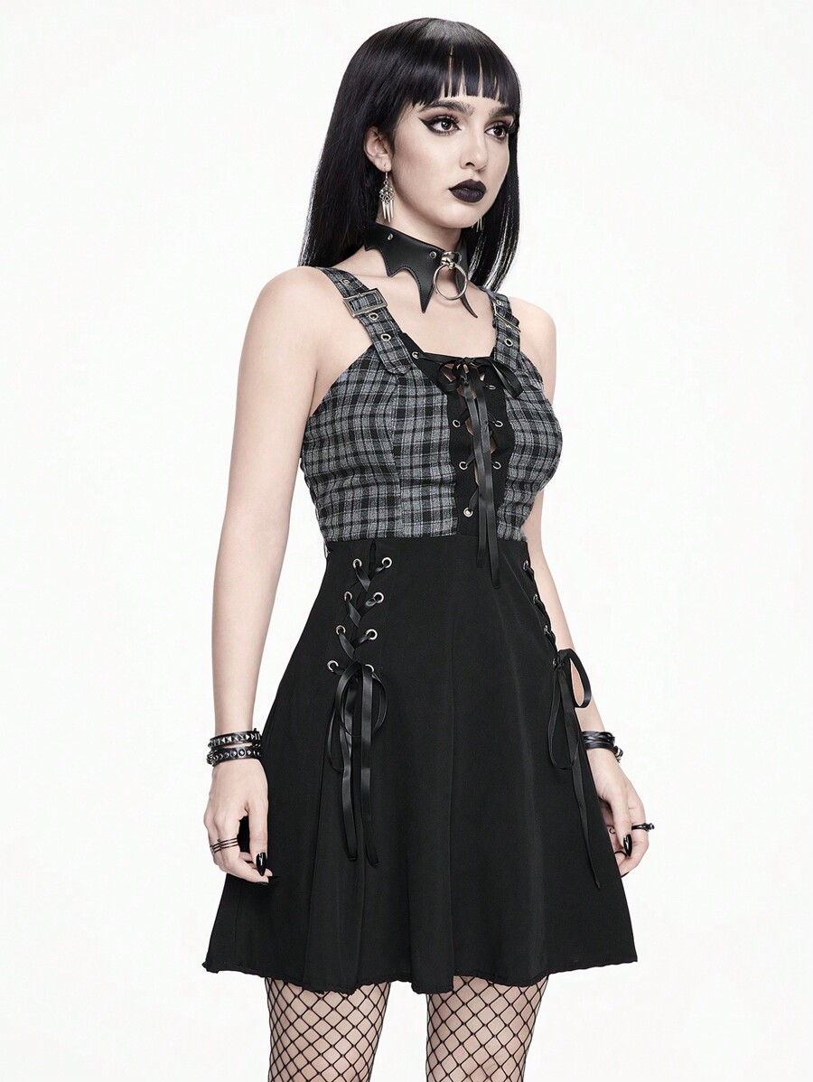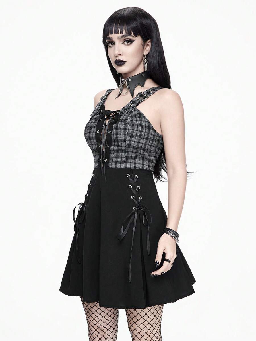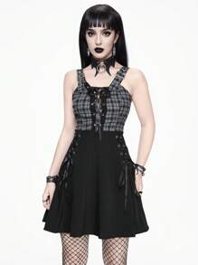 Goth Robe femme en ligne A de couleur unie avec lacets à œillets à carreaux, école