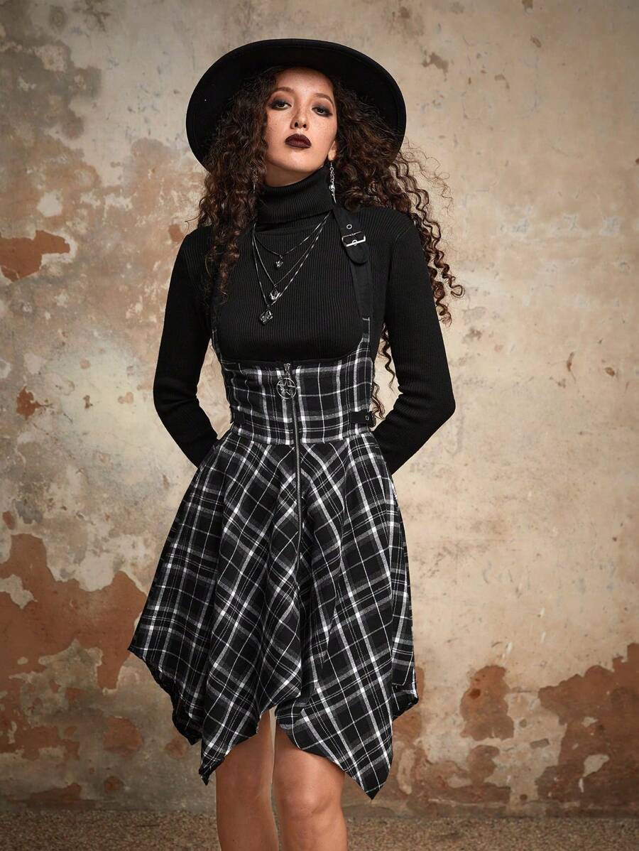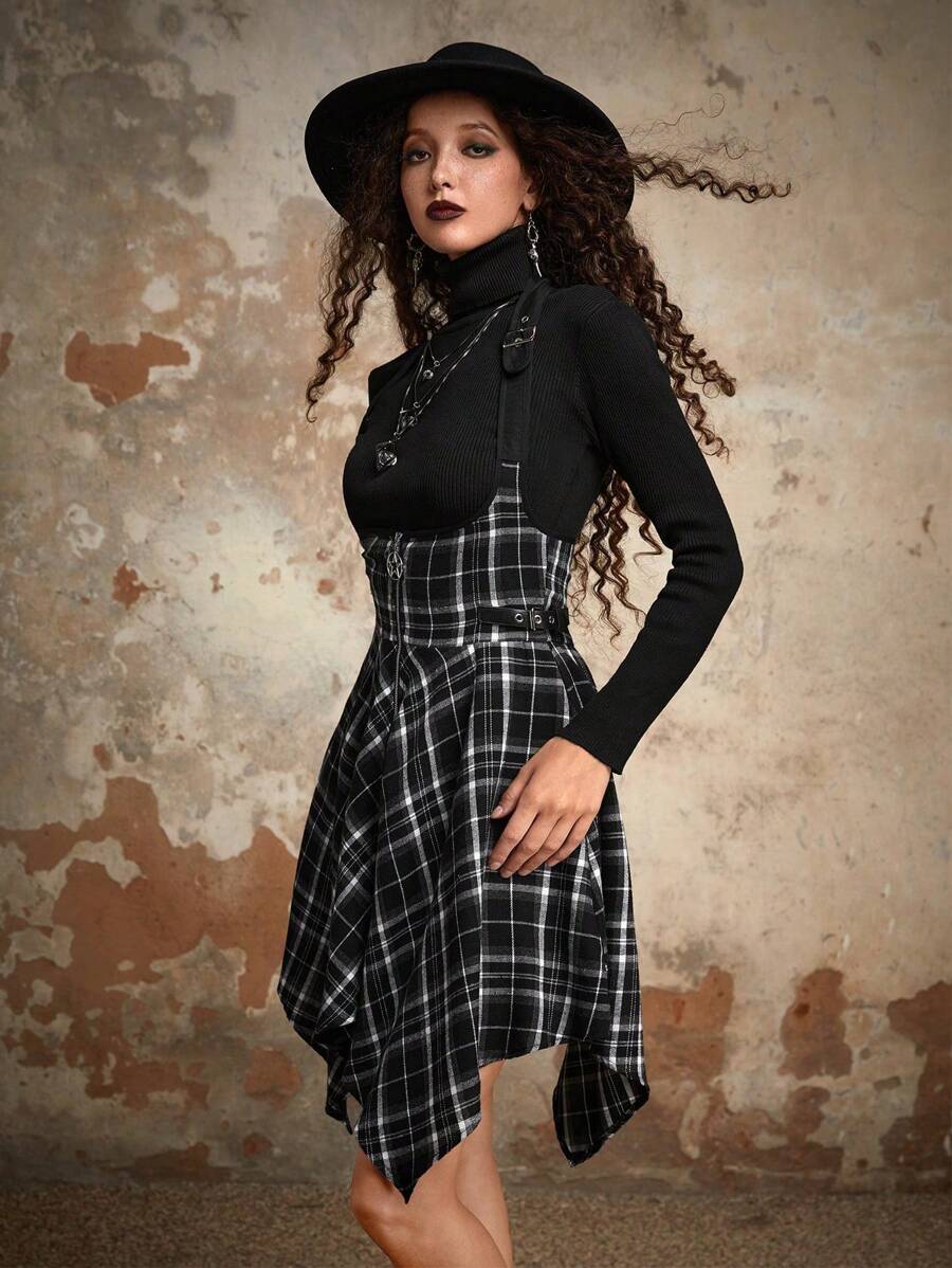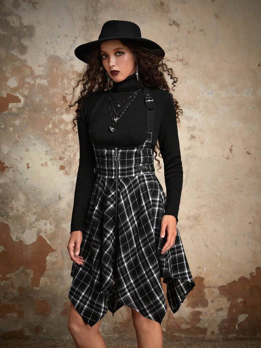 Goth Robe salopette à ourlet mouchoir à imprimé écossais sans t-shirt, école
