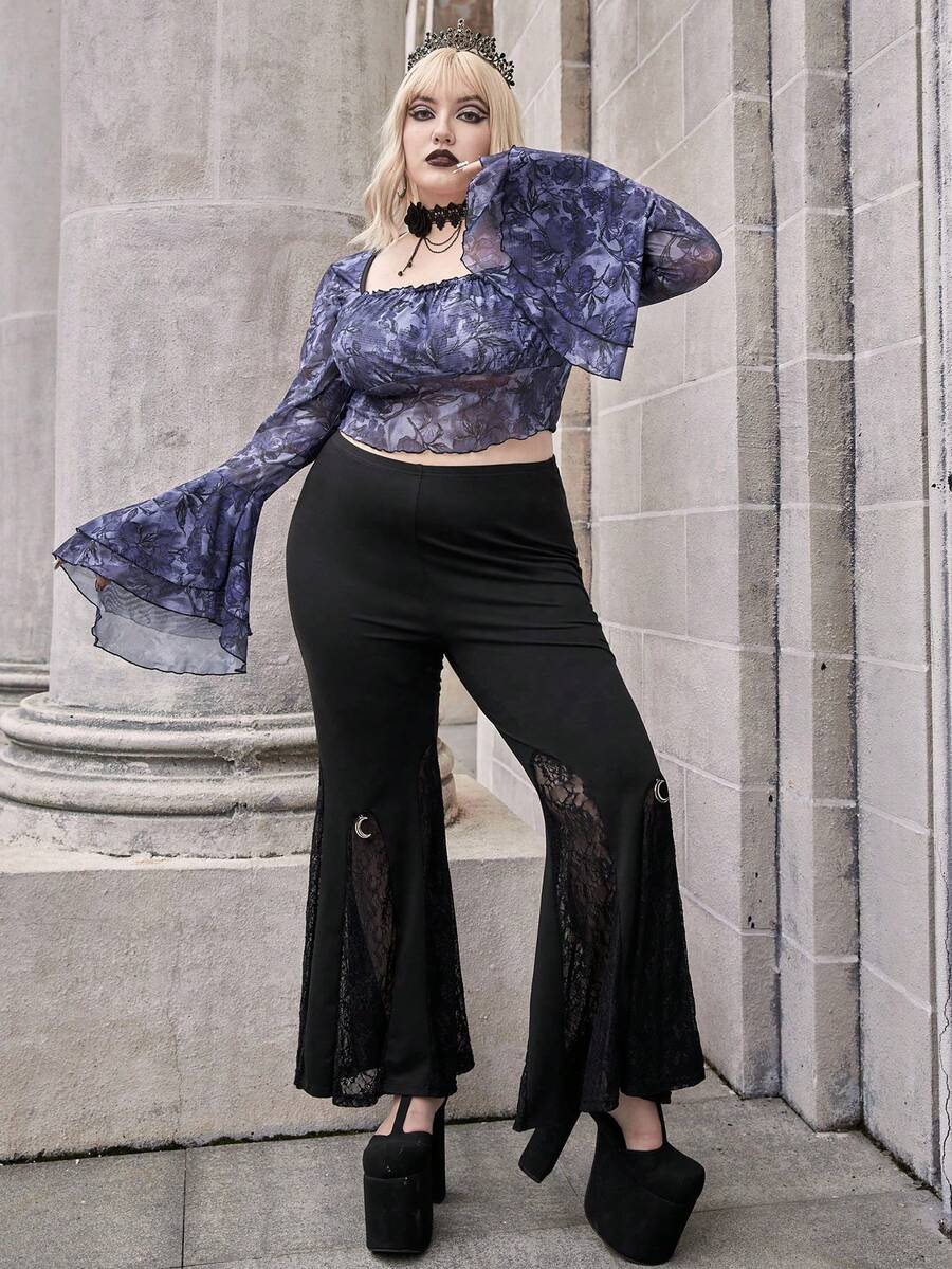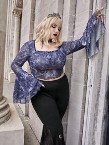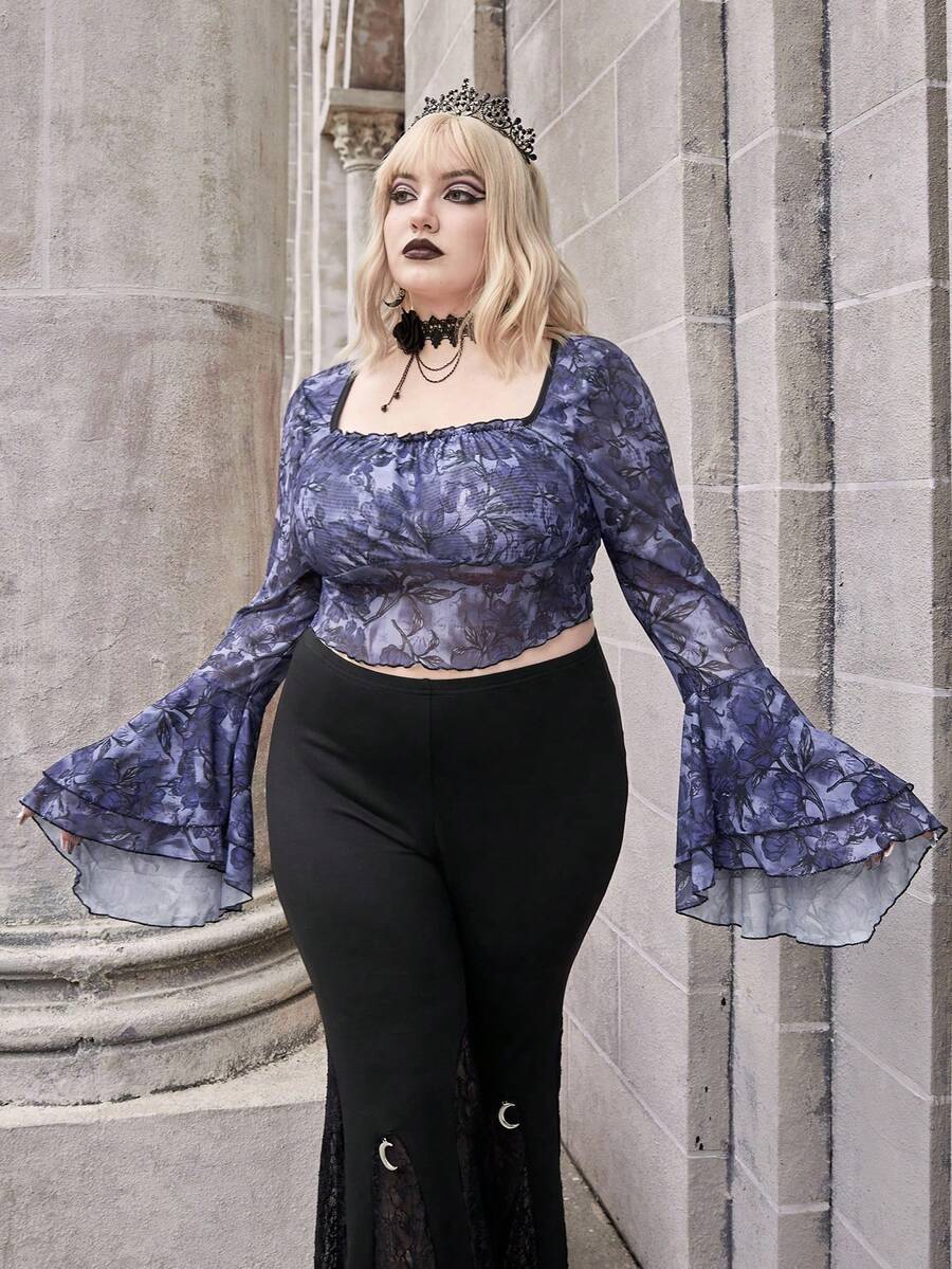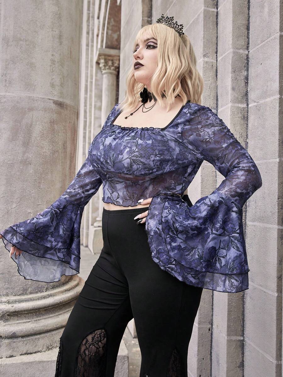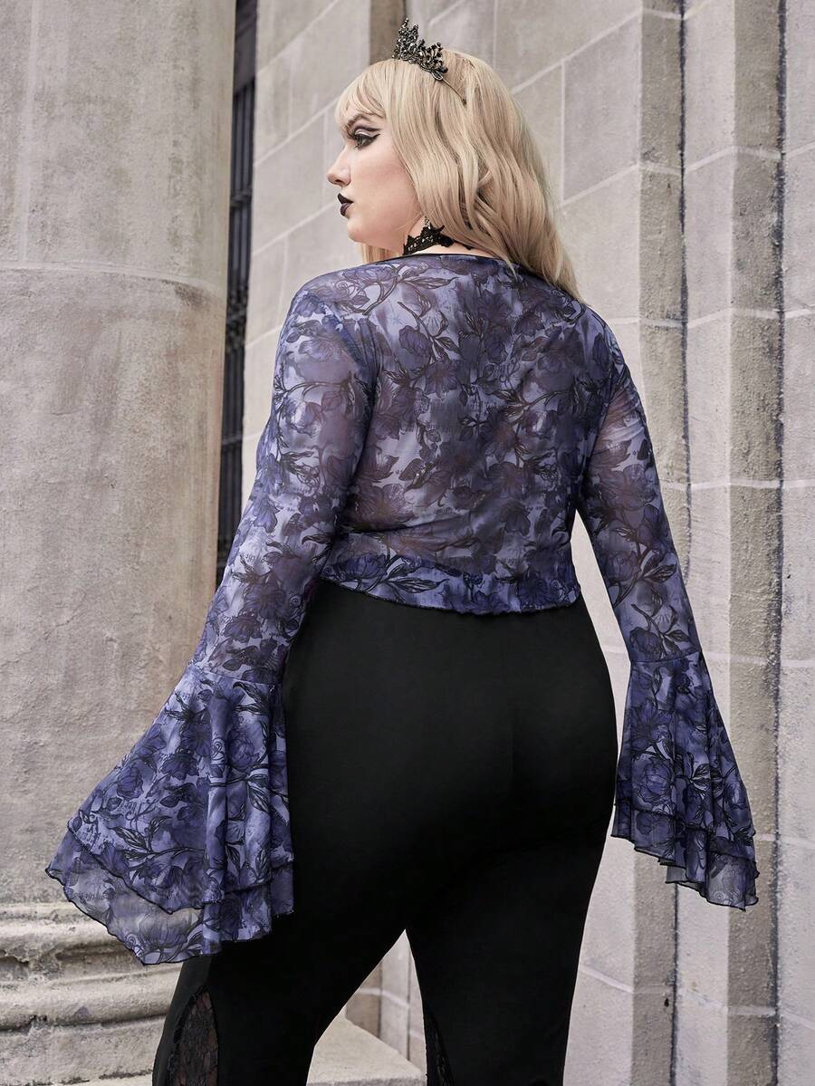 Goth Top Court Imprimé Floral Manches Évasées