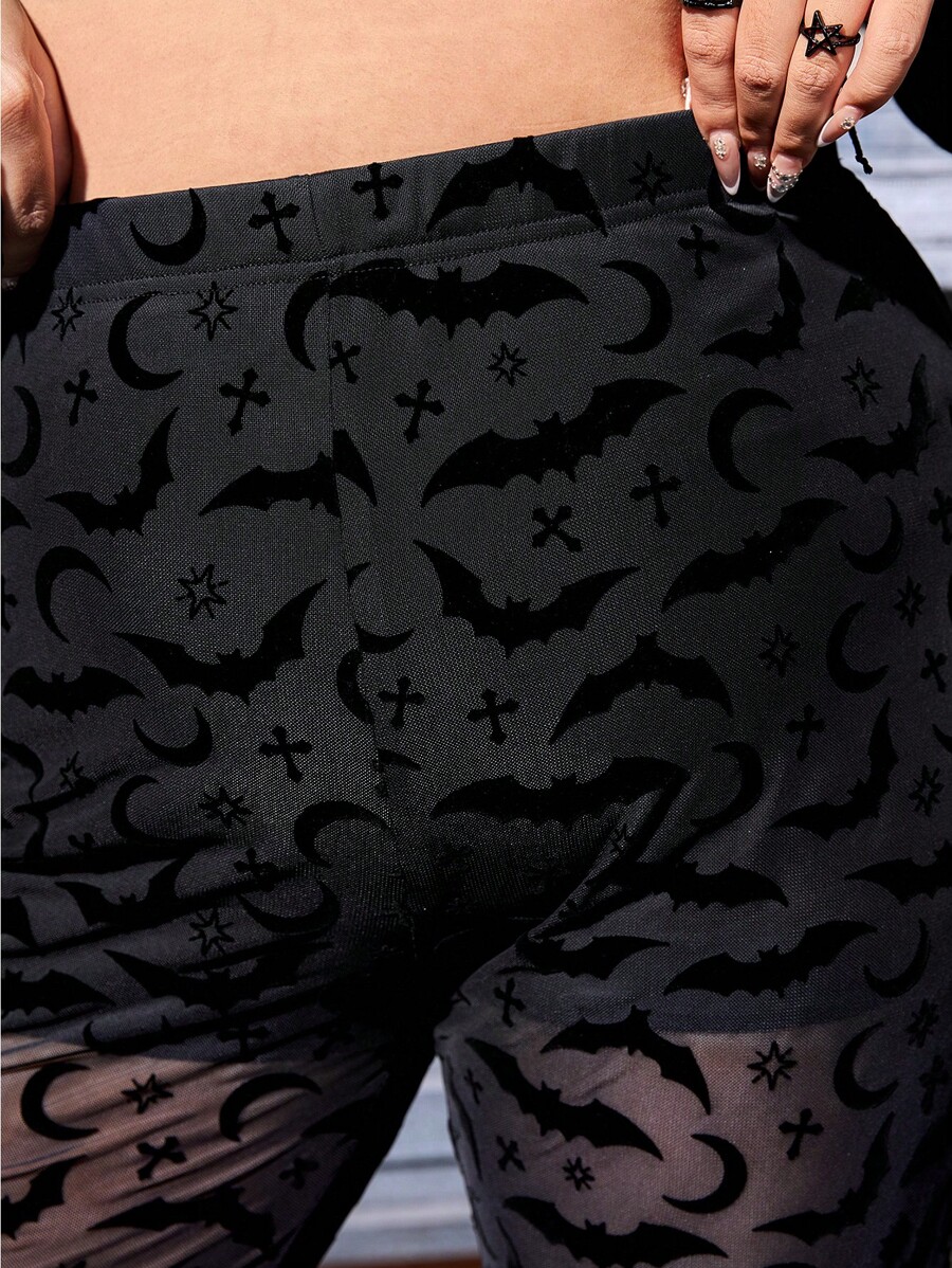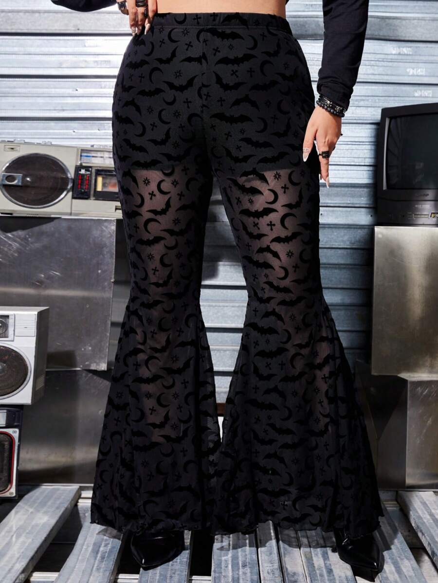 Pantalon évasé en velours pour grande taille avec imprimé lune et chauve-souris pour style gothique