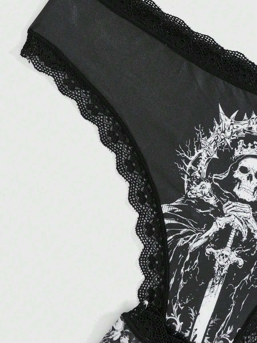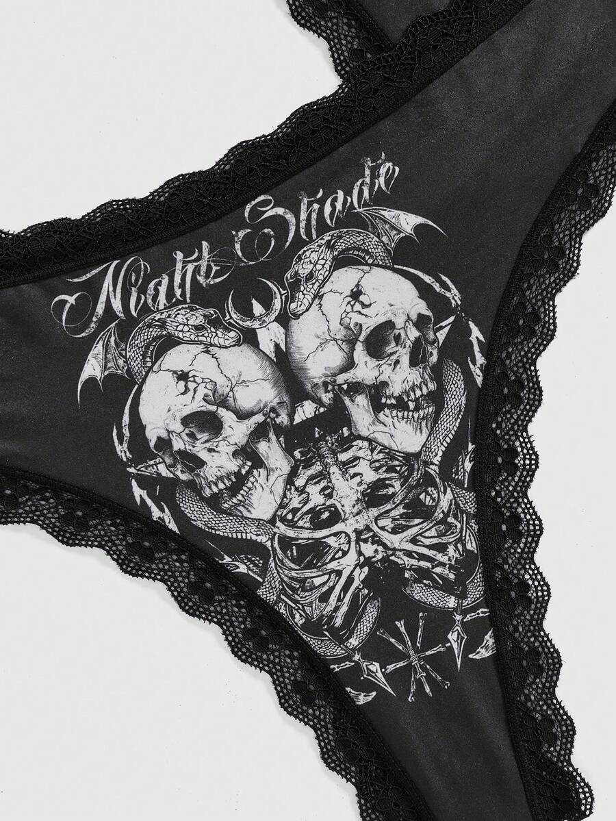 Goth Lingerie sexy à taille forte pour femme avec tanga à imprimé crâne et garniture en dentelle