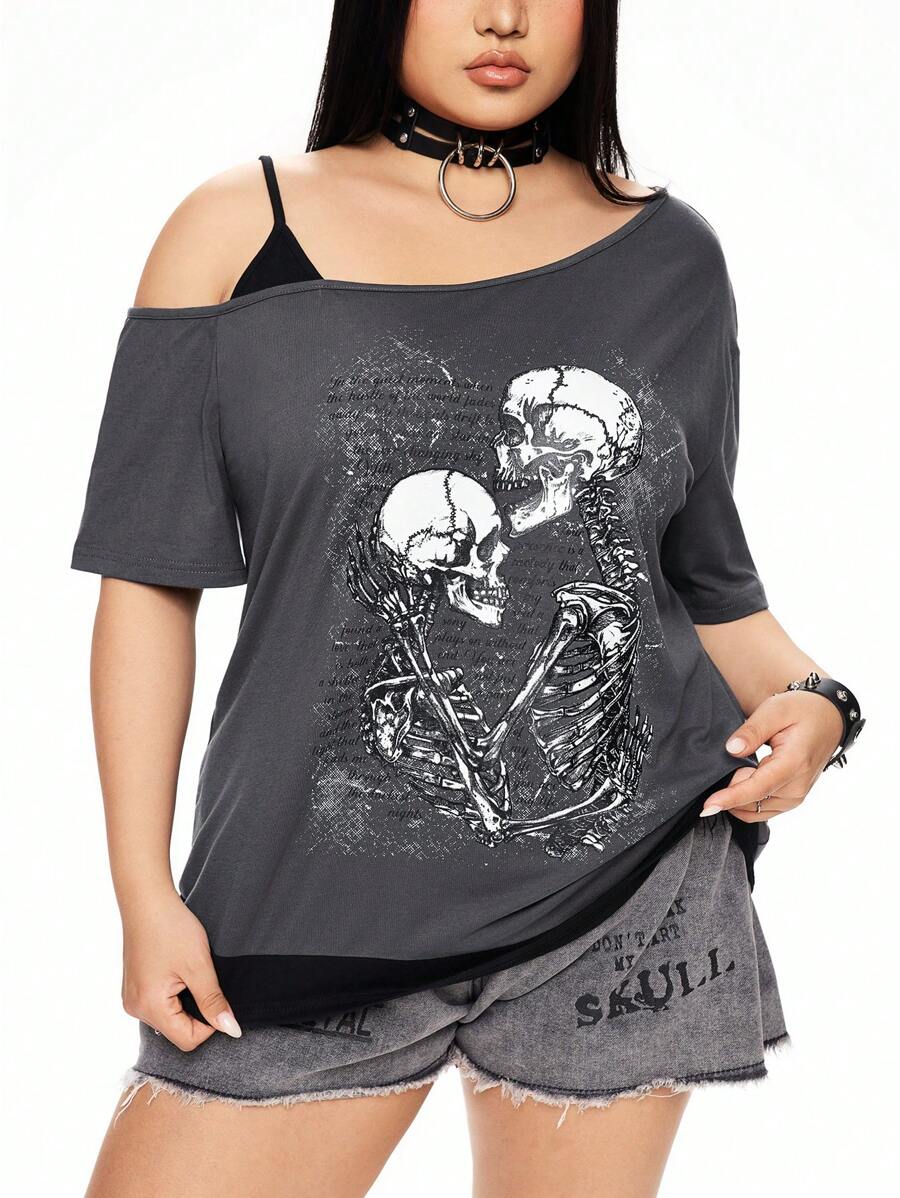 T-shirt gothique grande taille coupe ample avec épaules obliques, imprimé tête de mort et texte, 2 en 1