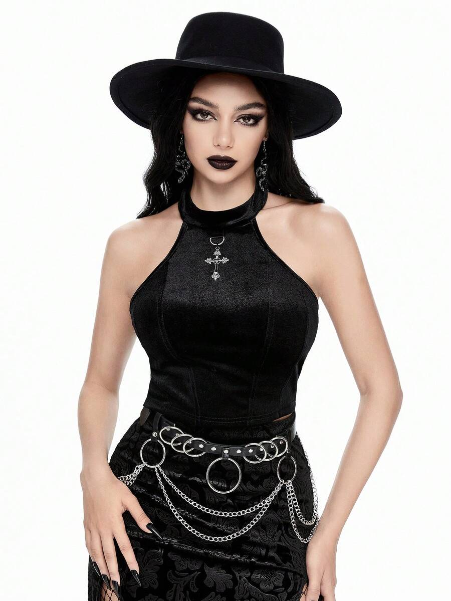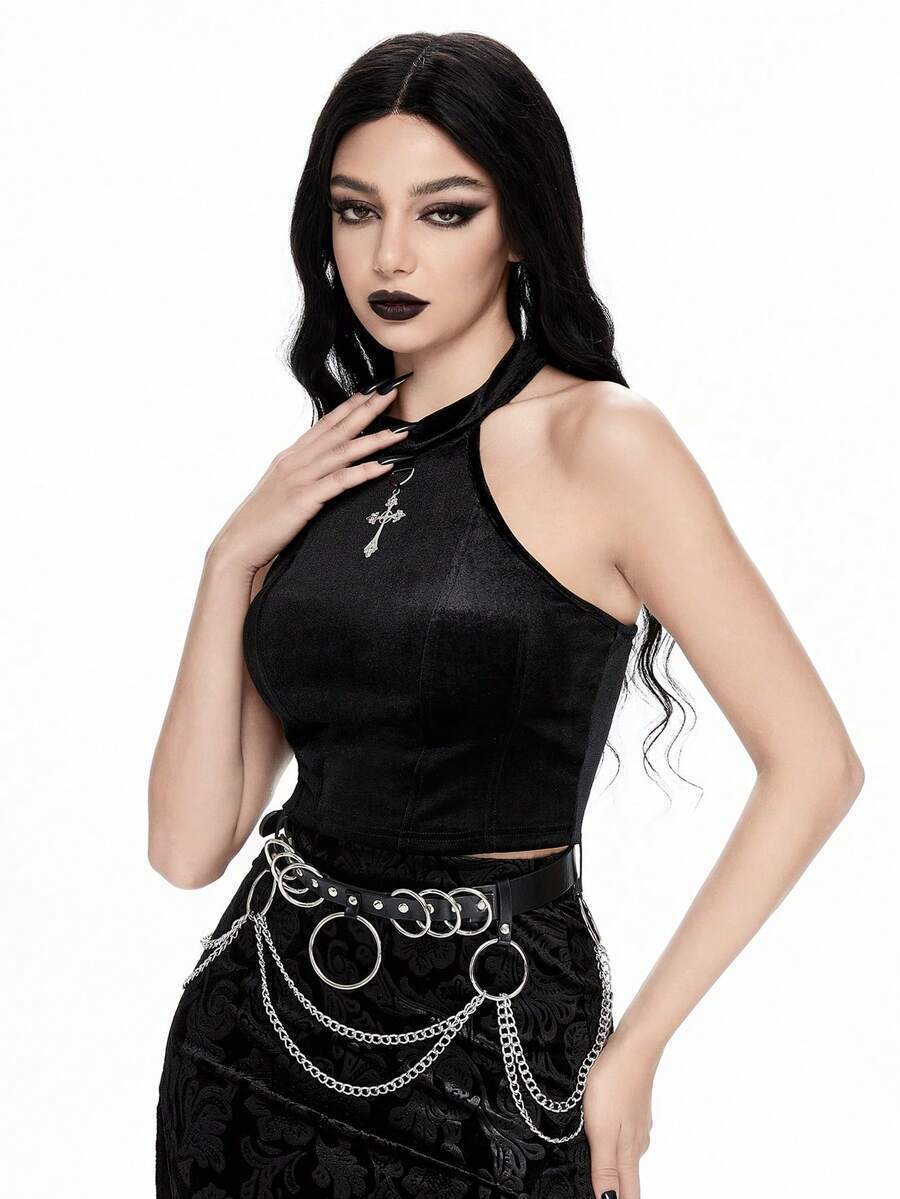 Débardeur ajusté en velours avec pendentif en métal croix gothique sexy pour femme