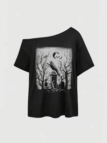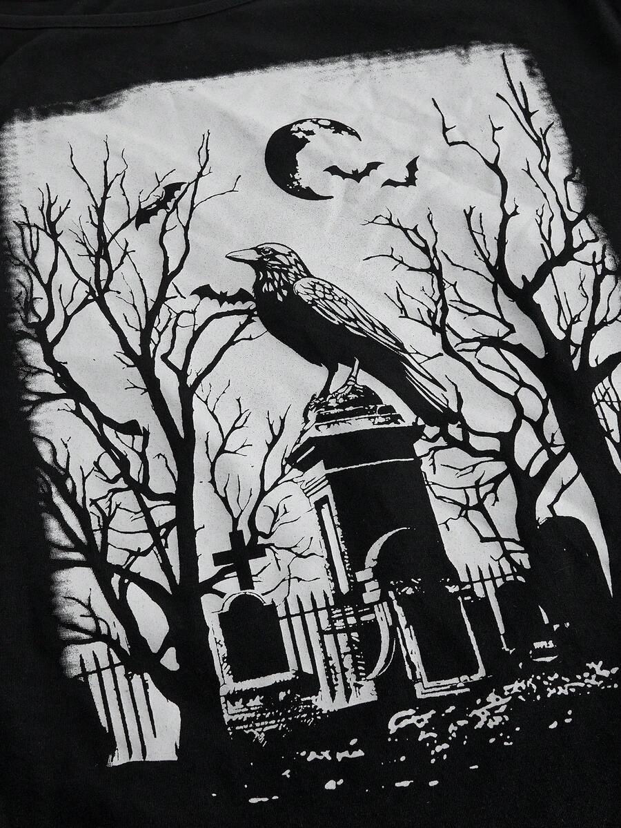Goth T-shirt femme imprimé d'un mystérieux corbeau gothique sombre dans un cimetière avec des branches d'arbre