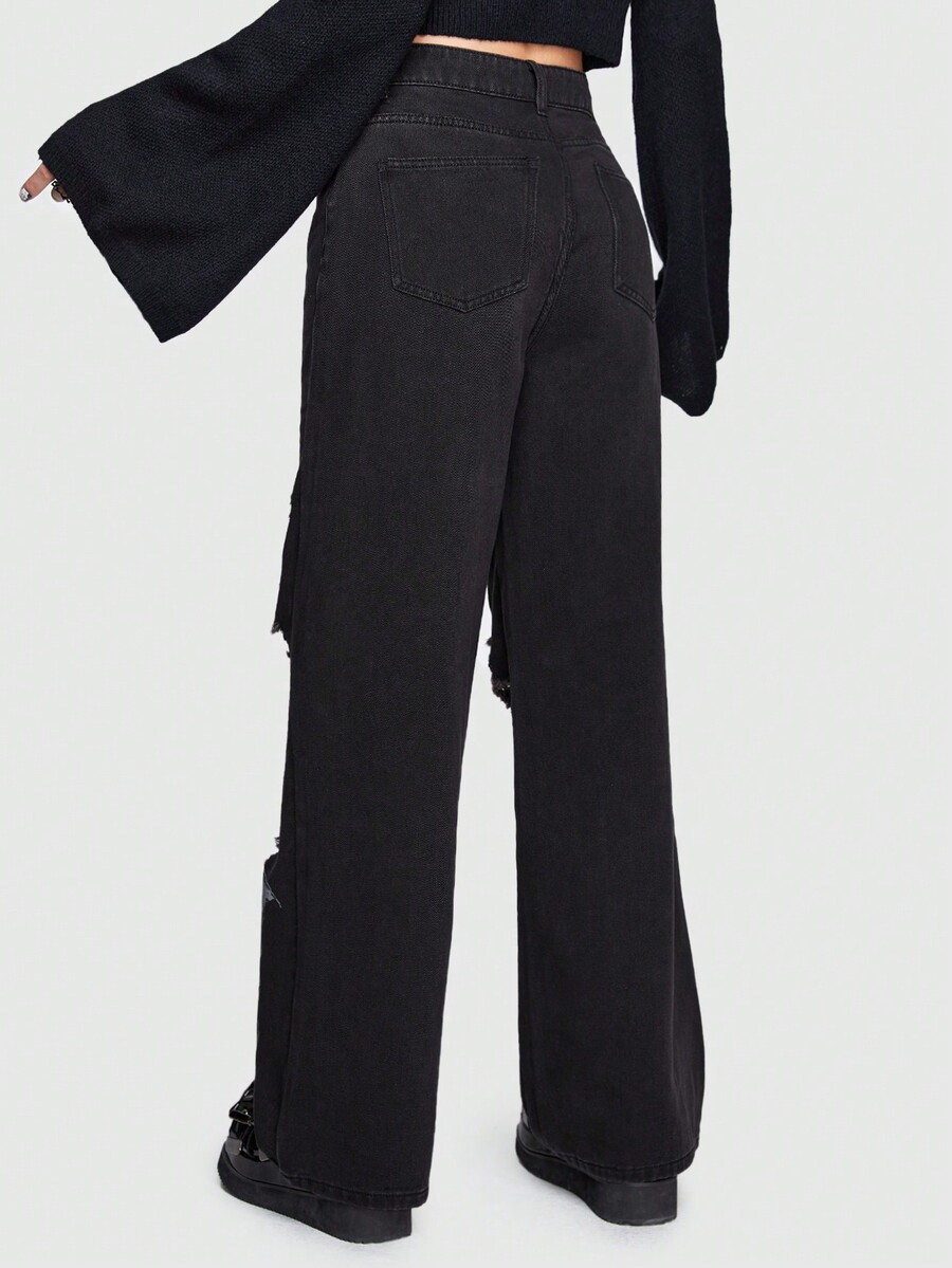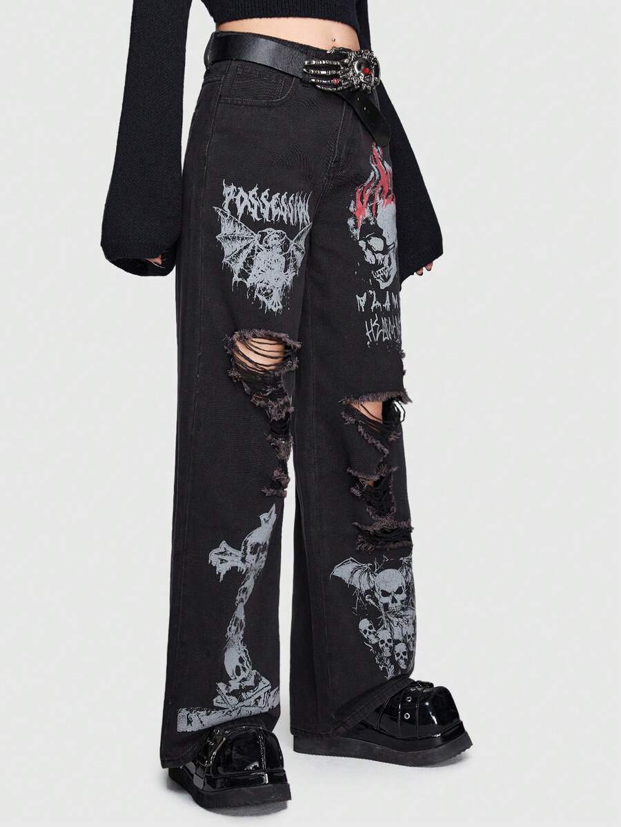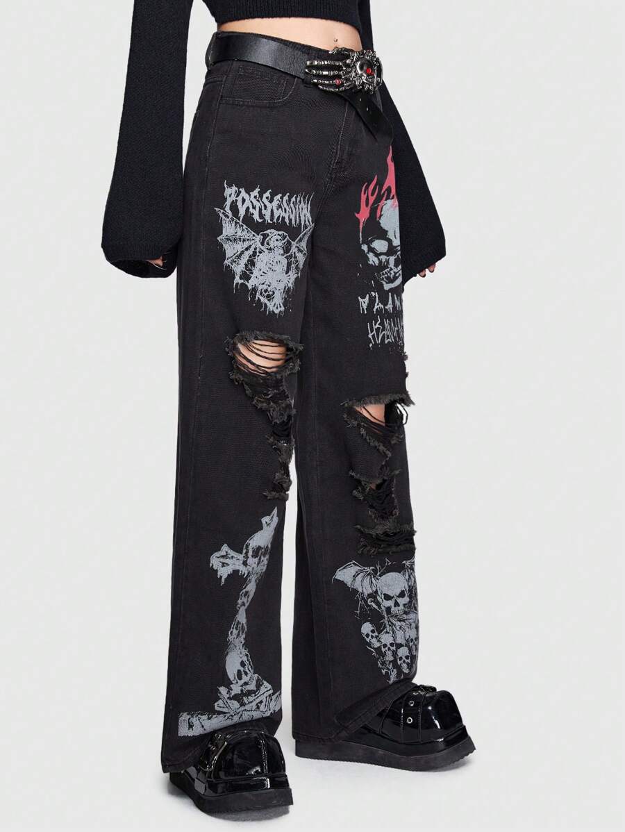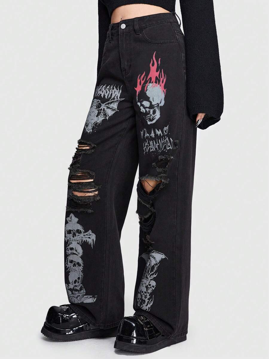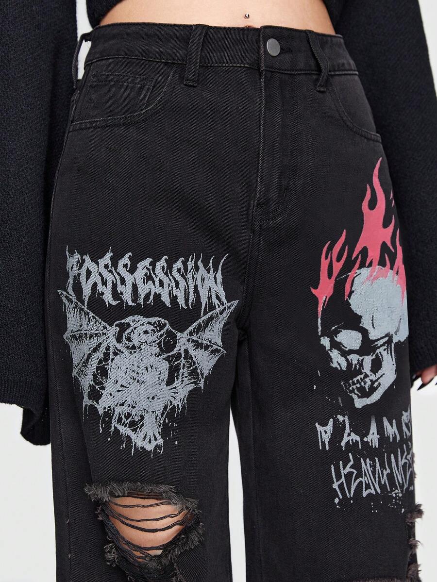 Goth Jean Ample Déchiré Tête De Mort & Flamme & Motif Tête De Mort