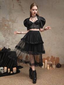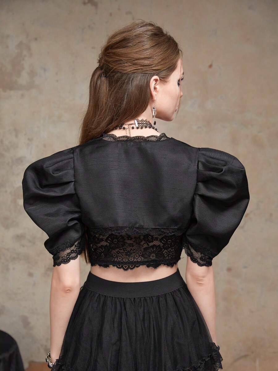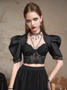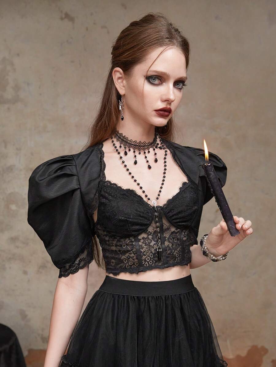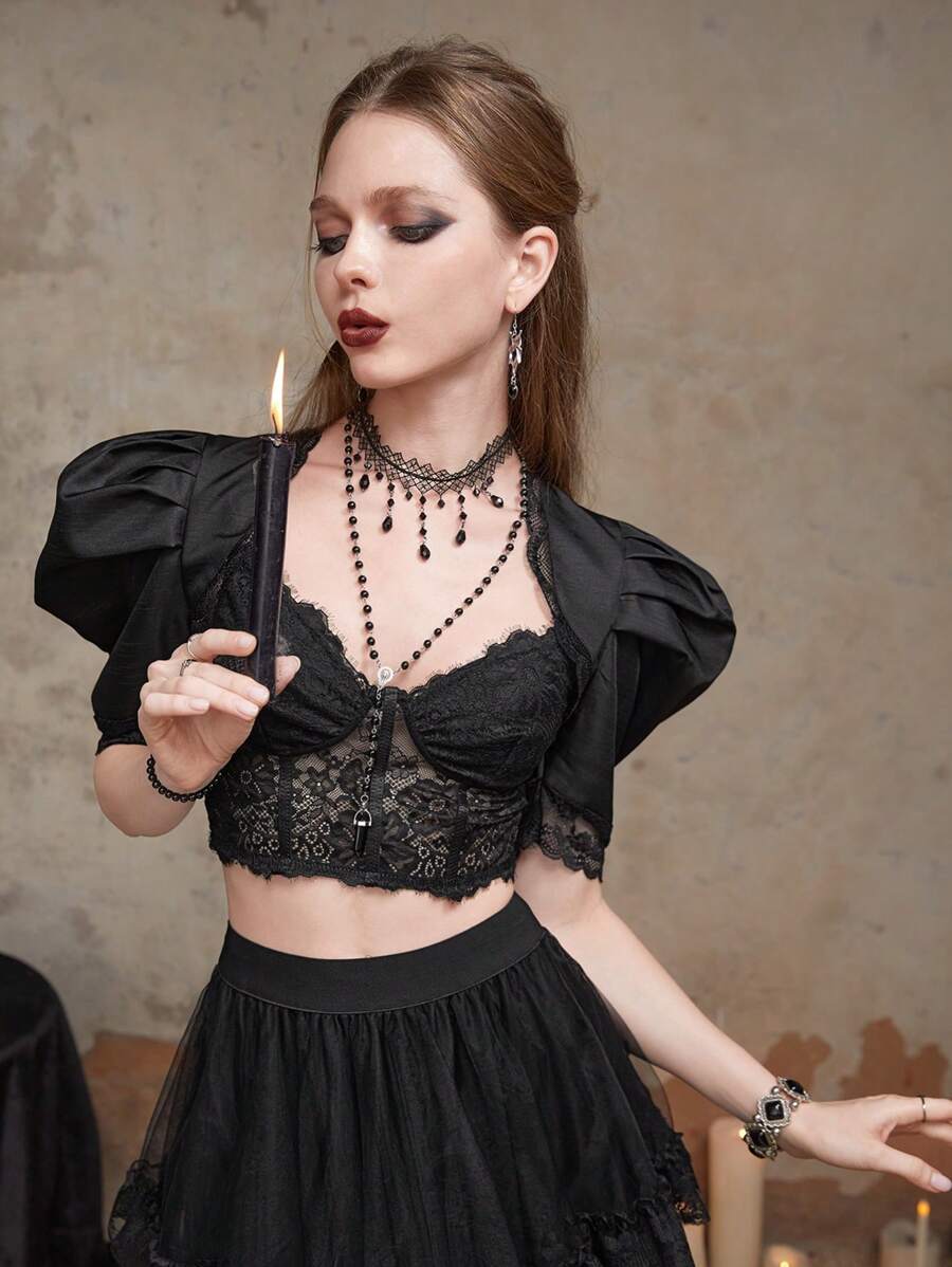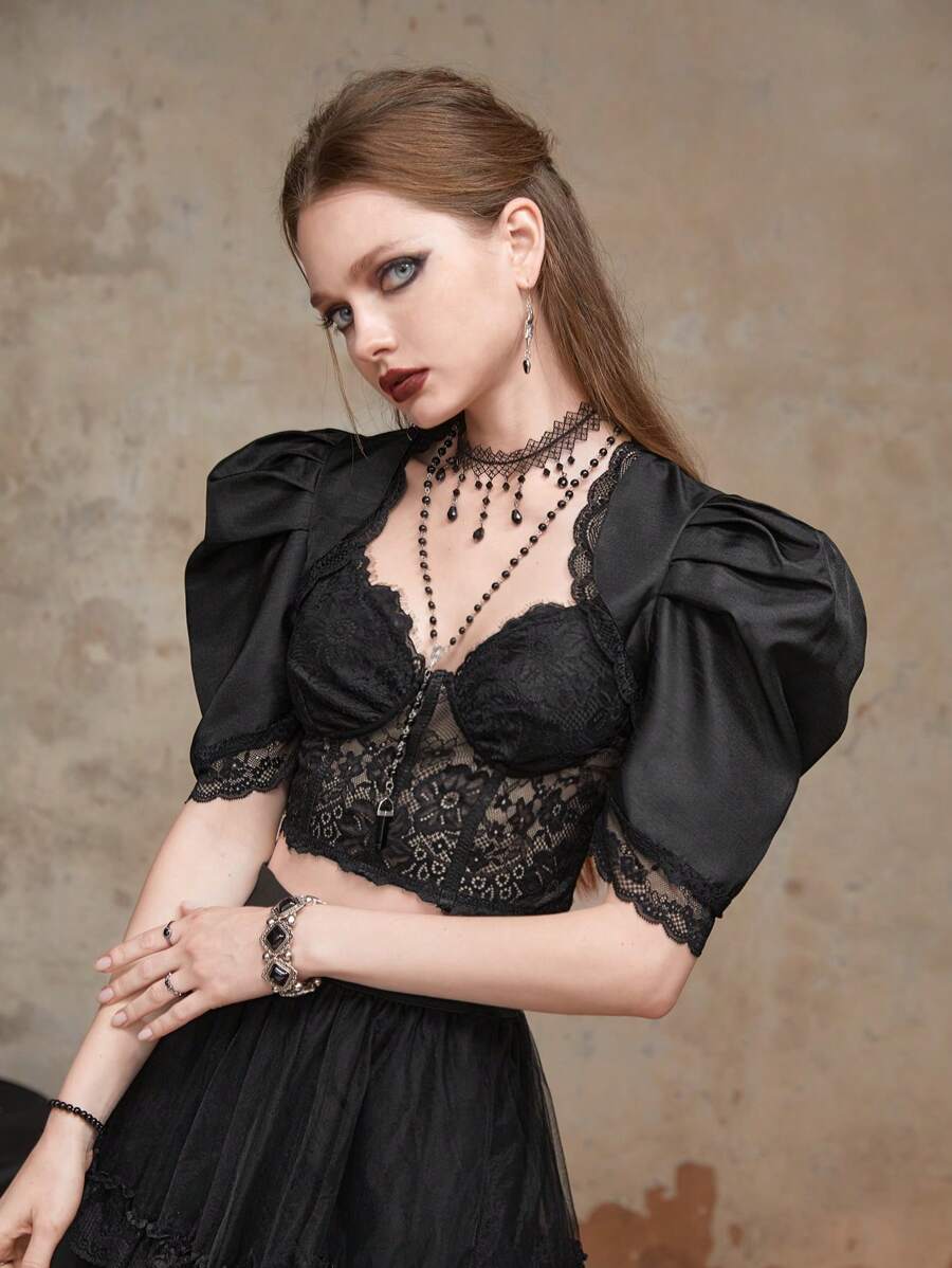 Goth Top Court Unicolore En Dentelle Manches Bouffantes