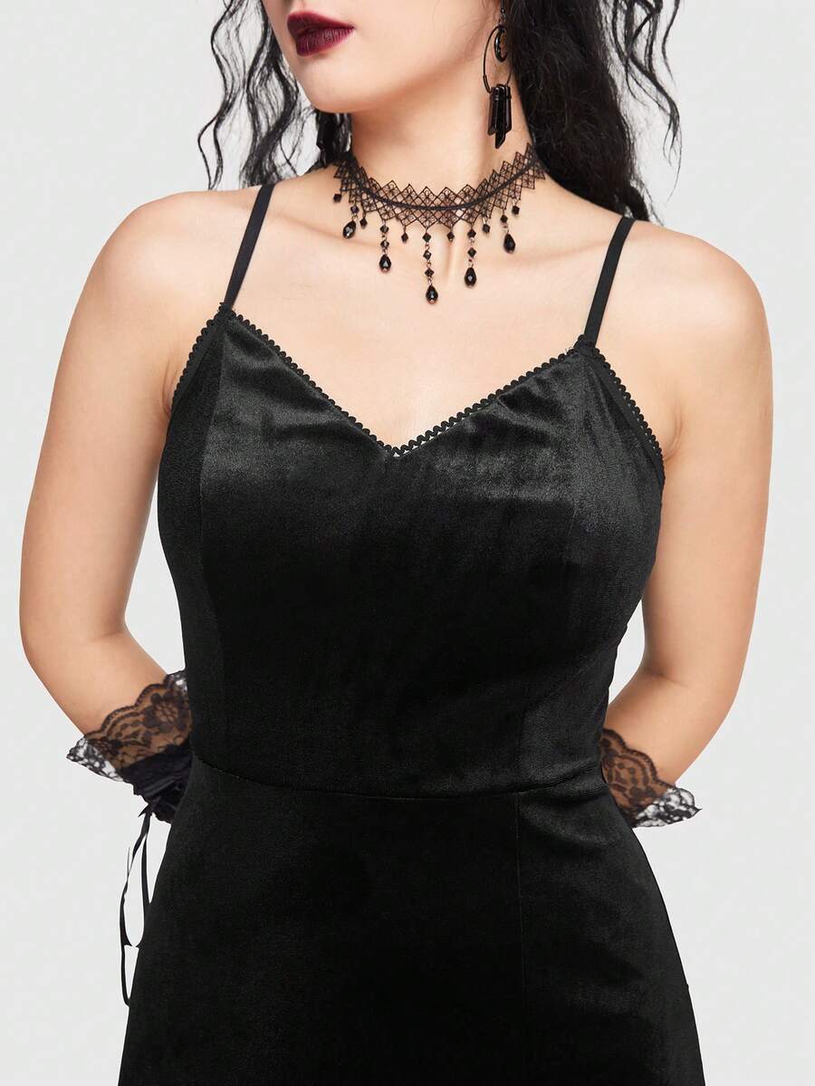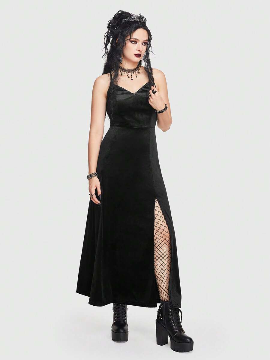 Goth Robe À Fines Brides Unicolore Fendu En Velours Sans Gants