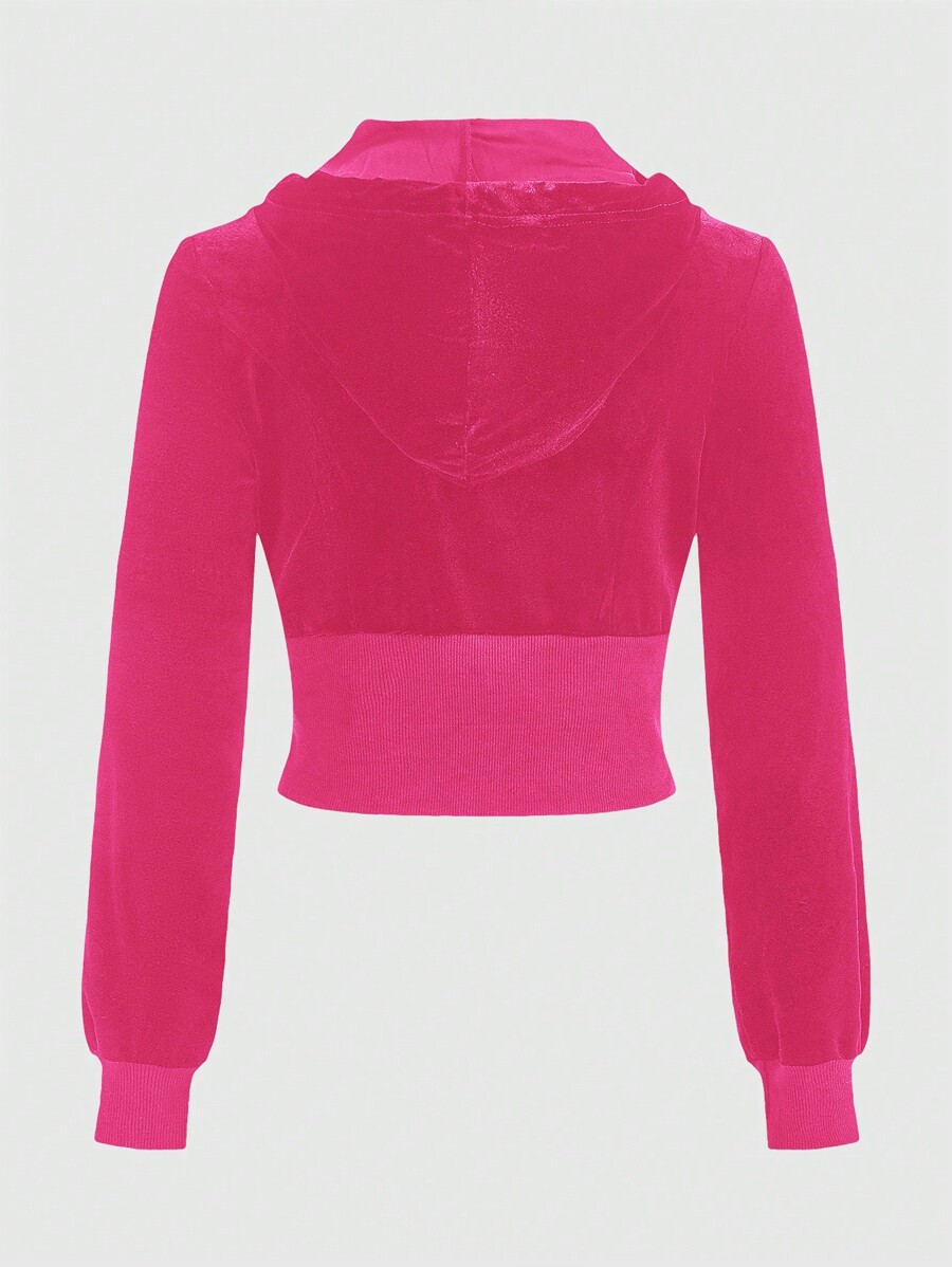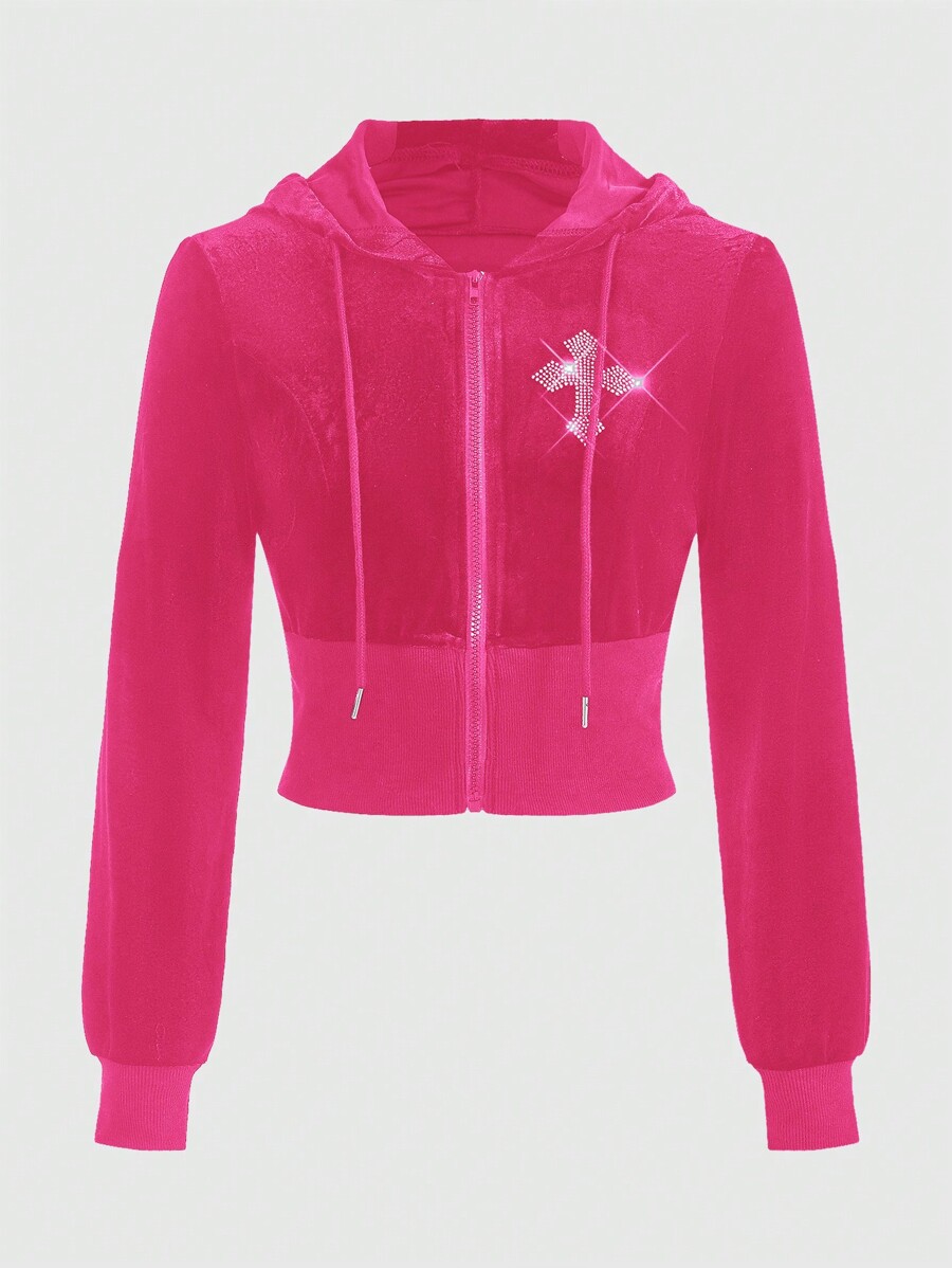 Goth Ensemble de 2 pièces pour femmes : un sweat-shirt à capuche zippé rose avec des strass en forme de croix style "Baddie Y2K" et une combinaison en velours noir tricoté avec taille à cordon de serrage